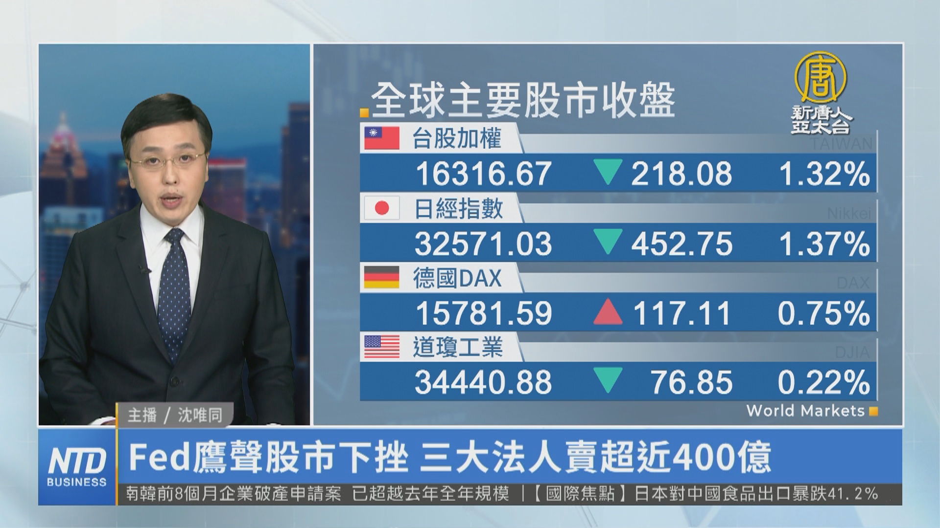 Fed鷹聲股市下挫 三大法人賣超近400億