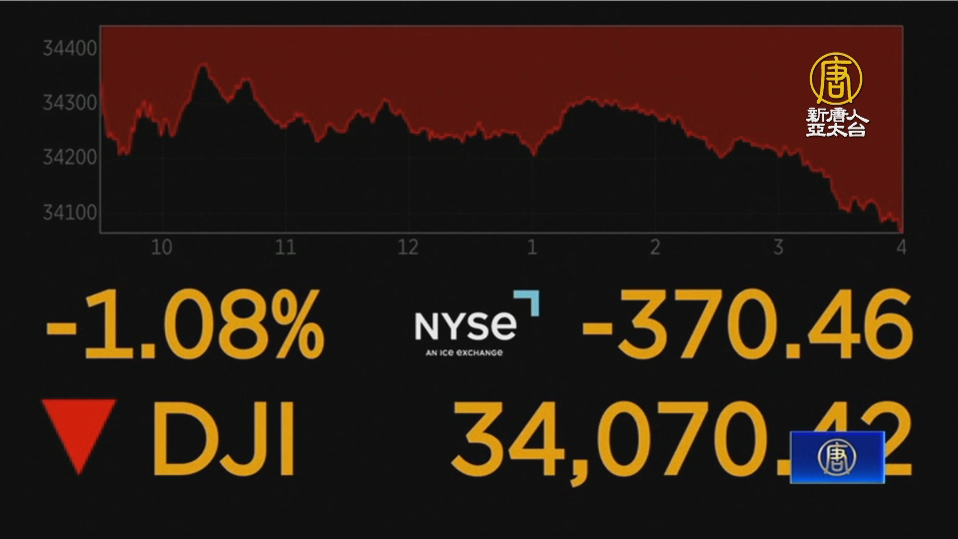 美股道瓊指數下跌 370.46 點,或 1.08%,收 34,070.42 點。