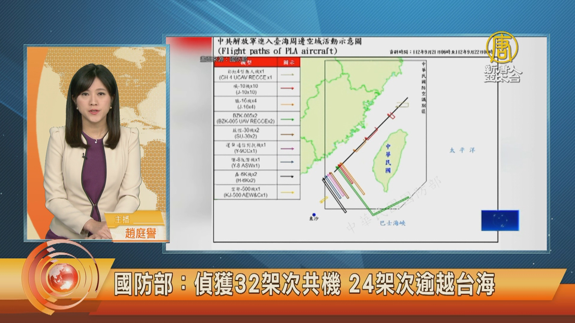 【新唐人亞太台 2023 年 09 月 22 日訊】新聞開始先來關心,共機擾台未停止,國防部公布,到今天早上6點為止的24小時內,偵獲共機32架次,其中逾越海峽中線及其延伸線進入北部、西南及東南空域有24架次、共艦7艘次,持續在台海周邊活動。國軍持續運用任務機、艦及岸置飛彈系統,嚴密監控與應處。