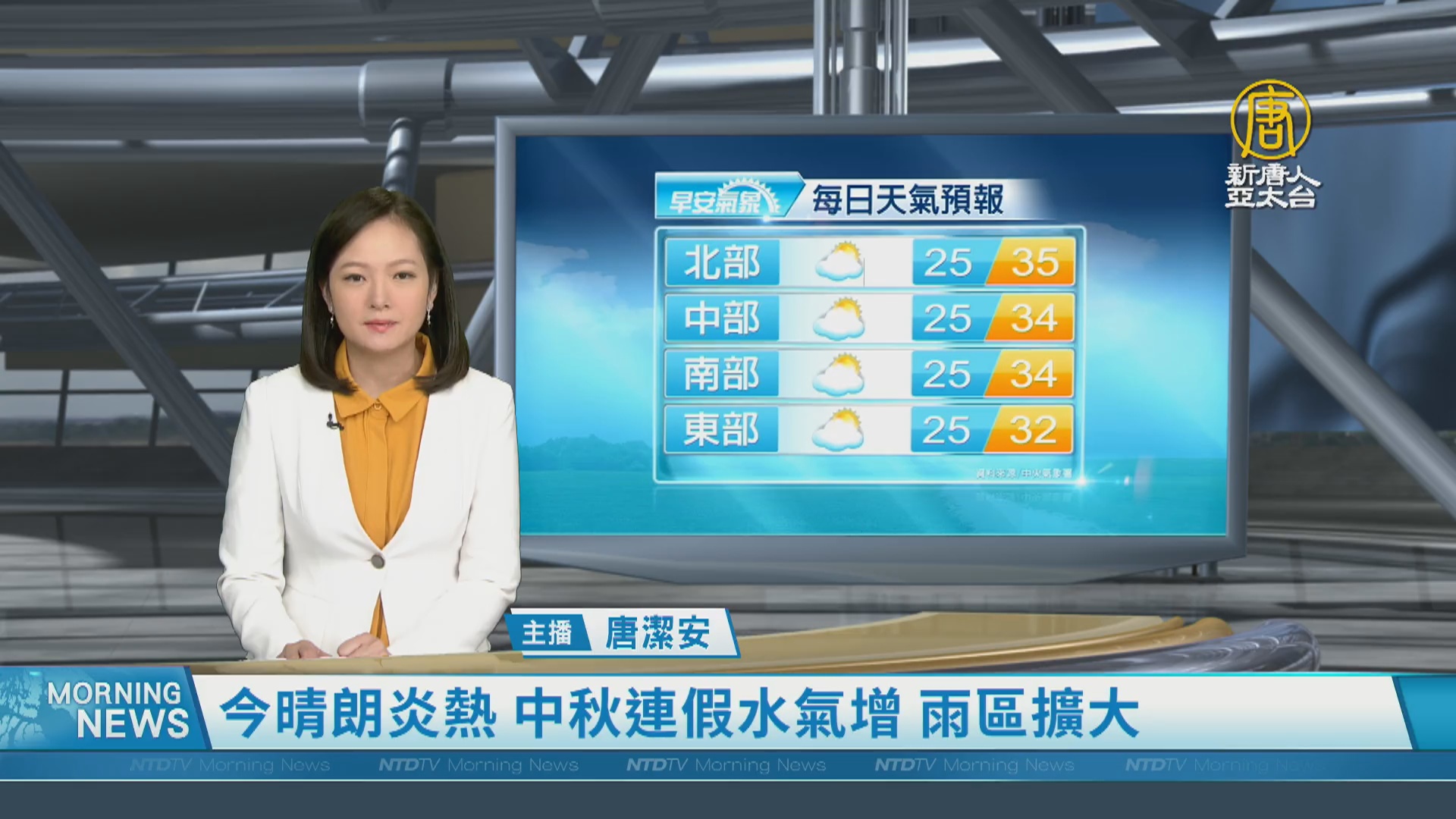 【新唐人亞太台 2023 年 09 月 25 日訊】歡迎您收看9月25日的早安新唐人,我是唐潔安,先來帶您關心天氣。迎接新的一週,今天到星期四,各地多雲時晴、白天氣溫微降仍偏熱;星期五開始,就是中秋三天連假,水氣增加,雨區擴大,提醒出遊的觀眾朋友要格外注意。帶您一起來看到國際媒體重要訊息。