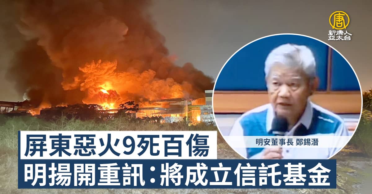 【新唐人亞太台 2023 年 09 月 25 日訊】位在屏東科技園區的高爾夫球廠明揚國際,廠房發生爆炸釀成9死百人受傷悲劇,明揚與母公司明安,星期天透過遠端視訊,召開重大訊息記者會,鞠躬致歉,表示將成立信託基金專款專用,協助傷、亡者及家屬,明揚指出,投保金額約15億元,目前有足額保險,配合火調及保險公司的調查,將盡快完成理賠程序。