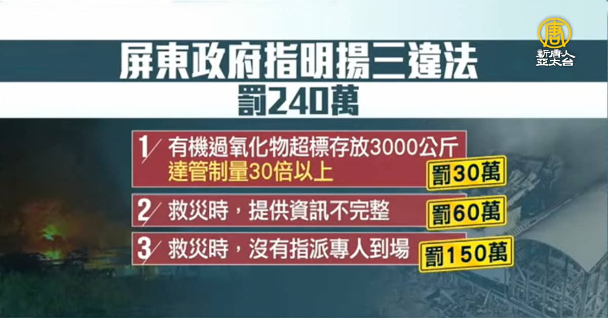 【新唐人亞太台 2023 年 09 月 25 日訊】再來關注,屏東明揚工廠大火9死百傷,其中有4名勇消殉職,一直到今天中午為止,還有一名明揚員工失蹤未尋獲,屏東縣長周春米今天上午在消防局開記者會,宣布明揚三項嚴重違規事項,包括,儲存超過管制數量30倍的有機過氧化物,另外,明揚第一時間提供的資料並不完整,以及,工廠管理人並沒有指派專人到現場協助救災。屏東縣政府裁罰管理權人,240萬元罰鍰。