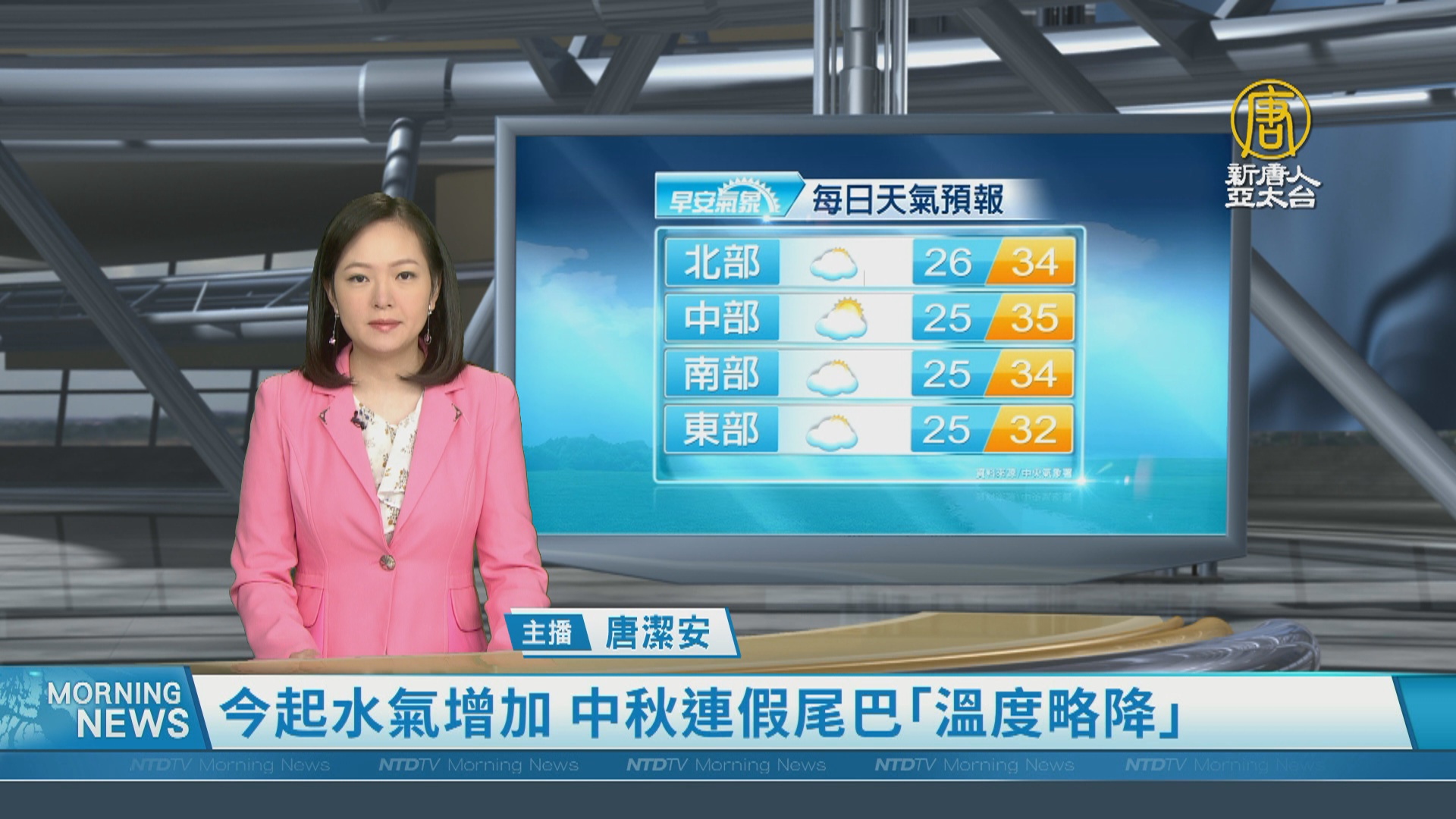 【新唐人亞太台 2023 年 09 月 26 日訊】歡迎您收看9月26日的早安新唐人,我是唐潔安,先來帶您關心天氣。氣象署表示,今天開始,水氣增加,北部、東半部地區及恆春半島有局部短暫陣雨,另外,中秋三天連假,午後有局部短暫雷陣雨。中秋賞月機率以中南部機會相對較高。帶您一起來看到國際媒體重要訊息。