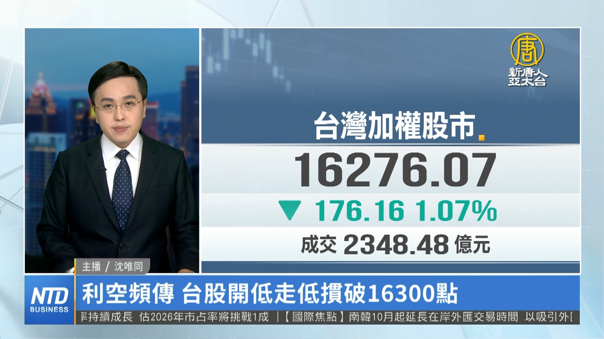 【新唐人亞太台 2023 年 09 月 26 日訊】新聞一開始帶您關心國際股市,美國10年期公債殖利率,突破4.5%至4.553%,創下16年高點,不過能源股領軍,加上科技巨頭表現不錯,美股四大指數同步收高。而在台股方面,今天呈現開低走低格局,電子權值股領跌,金融、傳產族群也欲振乏力,賣壓不斷出籠,終場加權指數下跌176.16點、跌幅1.07%,再度摜破16300點關卡,寫下4個月收盤新低。分析指出,市場利空消息頻傳,加上外資不斷調節部位,靜待市場出現止跌訊號之前,投資人可保守觀望較佳。