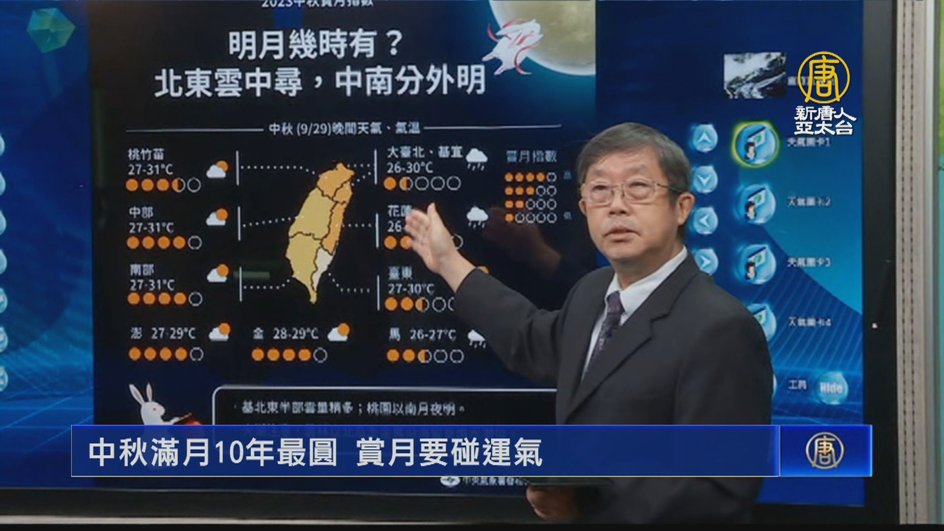 【新唐人亞太台 2023 年 09 月 29 日訊】今天(29日)就是中秋節了,今年的滿月將是10年來中秋月最圓的一次,不過,民眾要找最佳賞月地點的話,可能要到中南部比較合適。