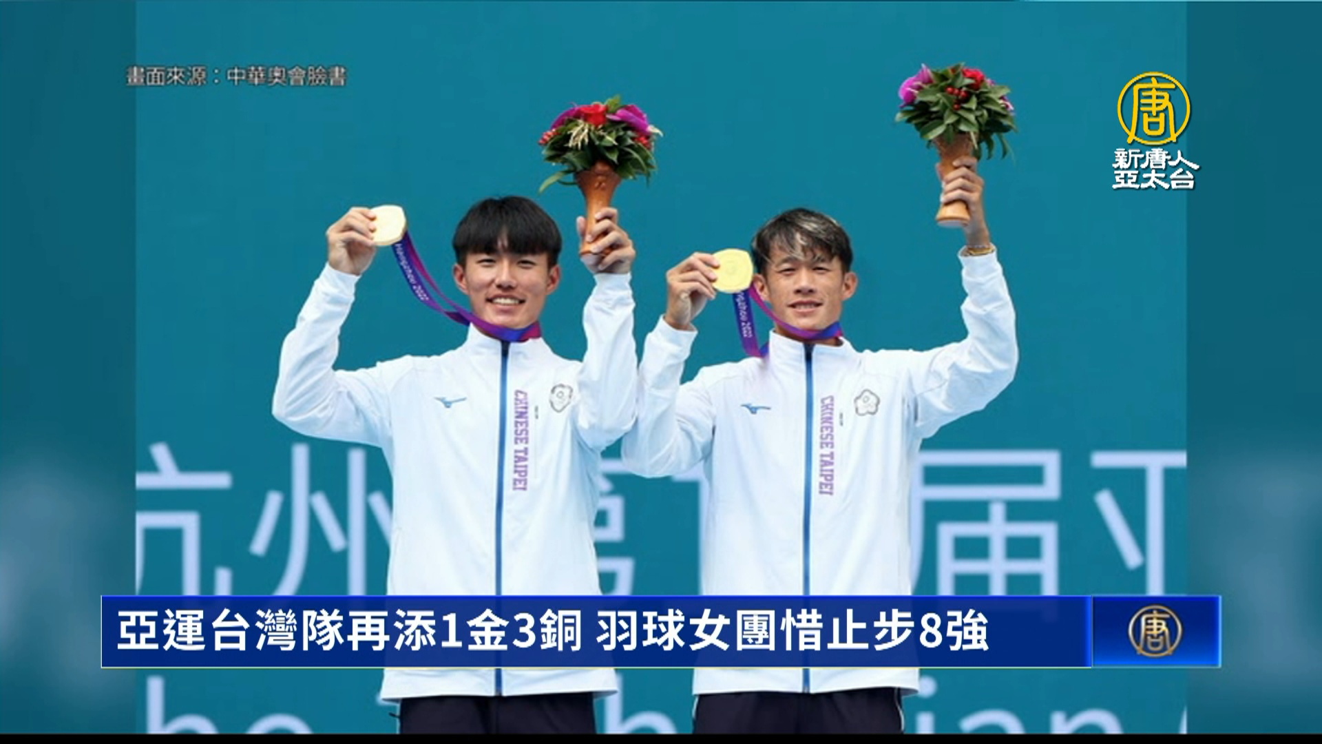 【新唐人亞太台 2023 年 09 月 29 日訊】亞運會,追蹤台灣好手的捷報。今天(29日)網球男子雙打許育修、莊吉生直落二擊敗印度,拿下在亞運網球項目第一面金牌。射擊項目,10公尺空氣手槍女子團體進帳一面銅牌。丁華恬則在亞運平衡木項目,為台灣女子隊拿下首面銅牌。桌球部分,女子單打鄭怡靜、陳思羽都挺進8強,女子雙打以及男子雙打4個組合,有兩個組合晉級8強,分別是女雙陳思羽、黃怡樺,男雙跨世代莊智淵、林昀儒。羽球女子團體,台灣羽球一姐「小戴」戴資穎領軍,不敵日本,止步八強。此外,蝶式游泳、與電競項目決賽,將在今晚7點以及8點48分上演,有望替台灣再添獎牌。