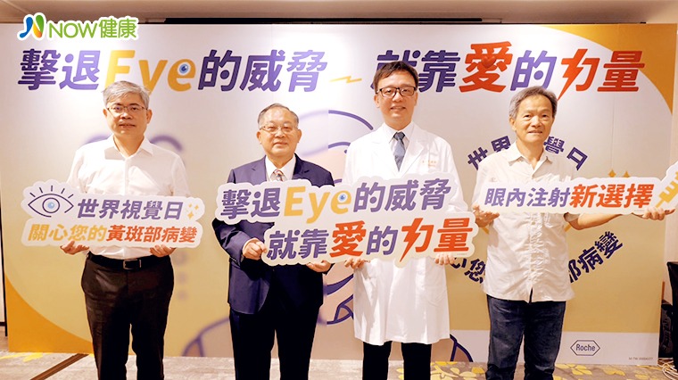 中華民國愛盲協會舉辦世界視覺日《擊退Eye的威脅,就靠愛的力量》關心黃斑部病變衛教記者會,左起中華民國愛盲協會吳建良秘書長、中華民國愛盲協會何一滔理事長、林口長庚紀念醫院眼科部黃奕修部長、黃斑部病變患者劉先生。(圖/中華民國愛盲協會提供)