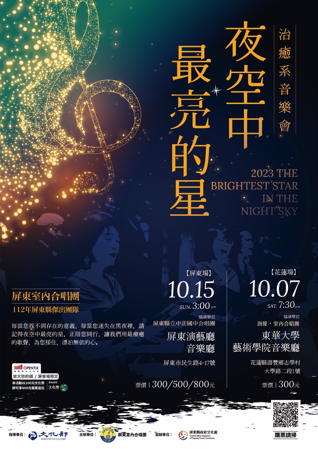 歡迎各界愛樂人士10月7日下午7:30,前往花蓮東華大學藝術學院音樂廳觀賞;或於10月15日下午3:00,於屏東演藝廳音樂廳,欣賞在地最優質的合唱團年度音樂會「夜空中最亮的星」音樂會。