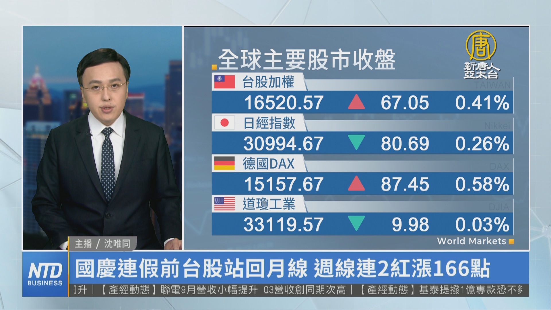 【新唐人亞太台 2023 年 10 月 06 日訊】新聞一開始帶您看到國際股市。美債殖利率走低,非農就業報告出爐前一天,投資人謹慎以待,週四(5日)美股小跌作收,標普500指數持穩在200日移動均線(約在4206點)之上。台股國慶連假前成交量明顯量縮,繼昨天大漲,今天也再度領漲,終場漲67點,收在16520點,週線連2紅,上漲166點。AI股、散裝航運、物聯網概念股、記憶體族群、IC設計族群、電動車概念股等都表現亮眼。