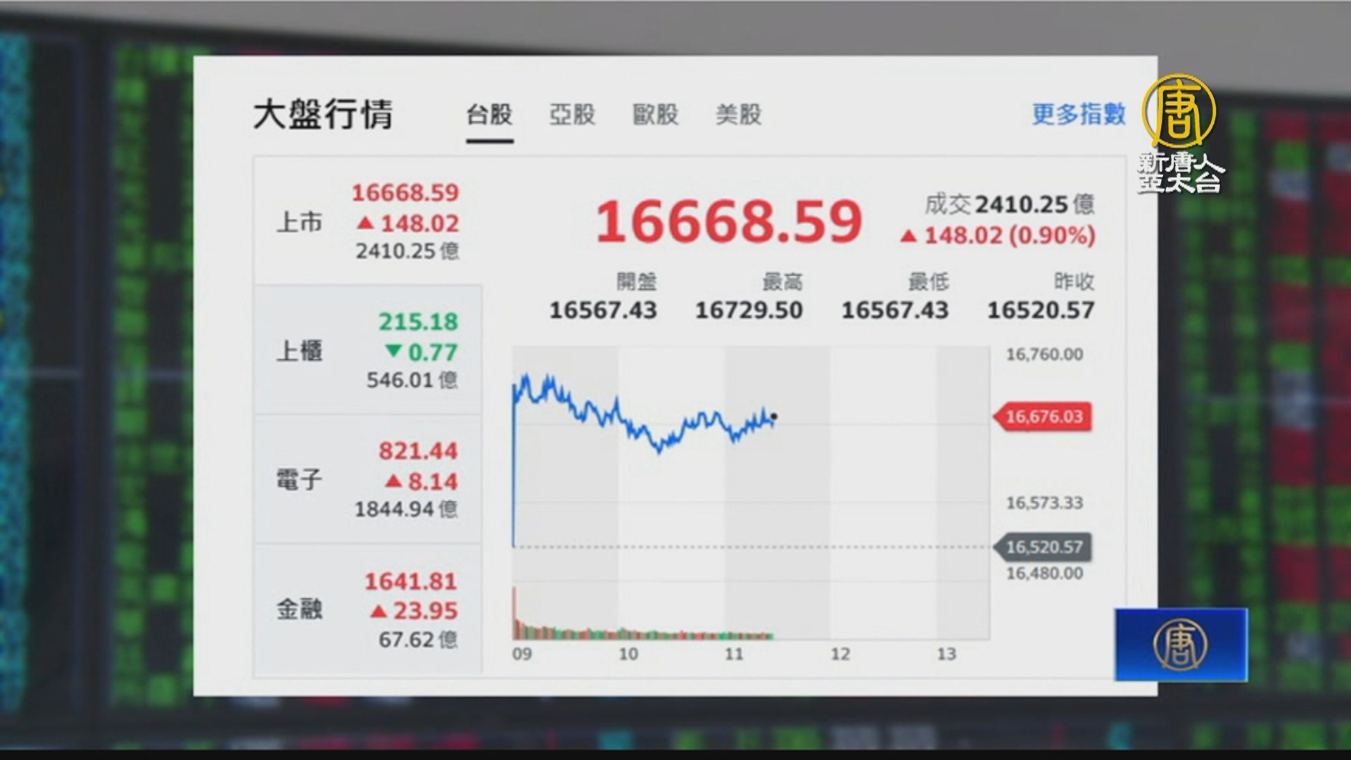 【新唐人亞太台 2023 年 10 月 11 日訊】國慶連假結束,台股今天展開補漲走勢,早盤指數一度超越16700點,最高上漲208點,突破半年線與季線關卡。台積電開盤上漲10元,市值增加2593億元,重登14兆元之上,貢獻大盤指數約82點。另外,以巴戰爭爆發,戰爭受惠族群包括軍工股、石化股、通訊股等的表現都引發關注,軍工股漲勢再起,雷虎(8033)以漲停開出,八貫(1342)一度衝上漲停,寶一(8222)、亞航(2630)也是領漲指標。美國股市週二連續三個交易日上漲,美債也創下8月來最佳單日表現,市場樂觀認為聯準會(Fed)升息已接近尾聲。