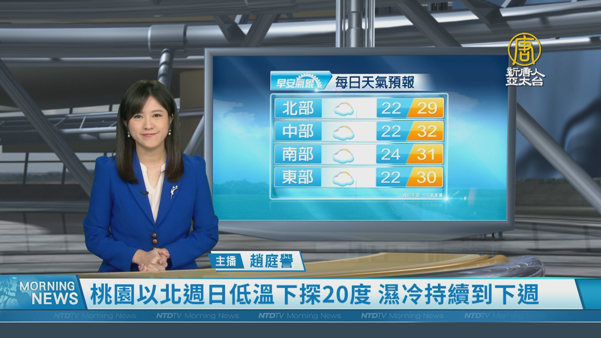 【新唐人亞太台 2023 年 10 月 13 日訊】歡迎您收看10月13日的早安新唐人,我是趙庭譽,先來帶您關心天氣。東北季風稍減弱,觀眾朋友把握今明兩天的好天氣,不過,15日星期天,東北季風預計再增強,各平地低溫約在攝氏21至24度;桃園以北、東半部有短暫雨。帶您一起來看到國際媒體重要訊息。