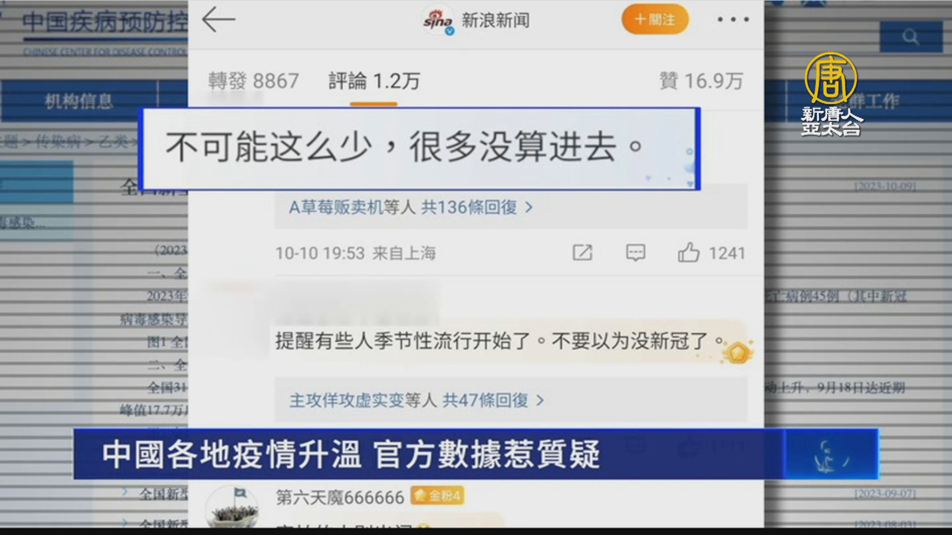 【新唐人亞太台 2023 年 10 月 13 日訊】中國疫情再度升溫,醫院發熱門診病患爆增。中共疾控中心最新通報聲稱,9月新增的新冠死亡病例為45例,重症398例。但民眾質疑實際疫情更加嚴重。