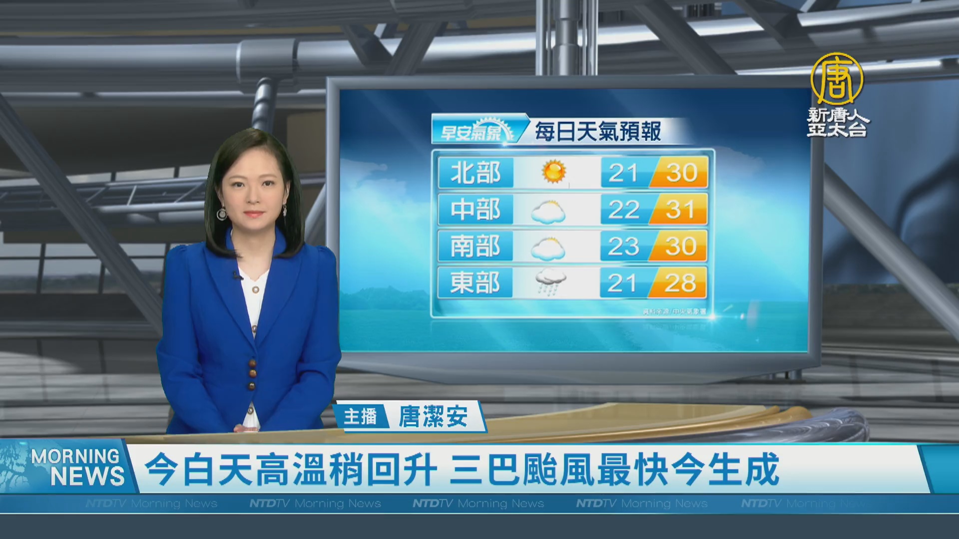 【新唐人亞太台 2023 年 10 月 18 日訊】歡迎您收看10月18日的早安新唐人,我是唐潔安,先來帶您關心天氣。今天白天高溫北部及東北部稍回升,新竹以南地區則為30、31度,感受溫暖偏熱,中南部日夜溫差稍大,另外,今年第16號颱風「三巴」有機會再今天生成,對台灣影響仍待評估。帶您一起來看到國際媒體重要訊息。