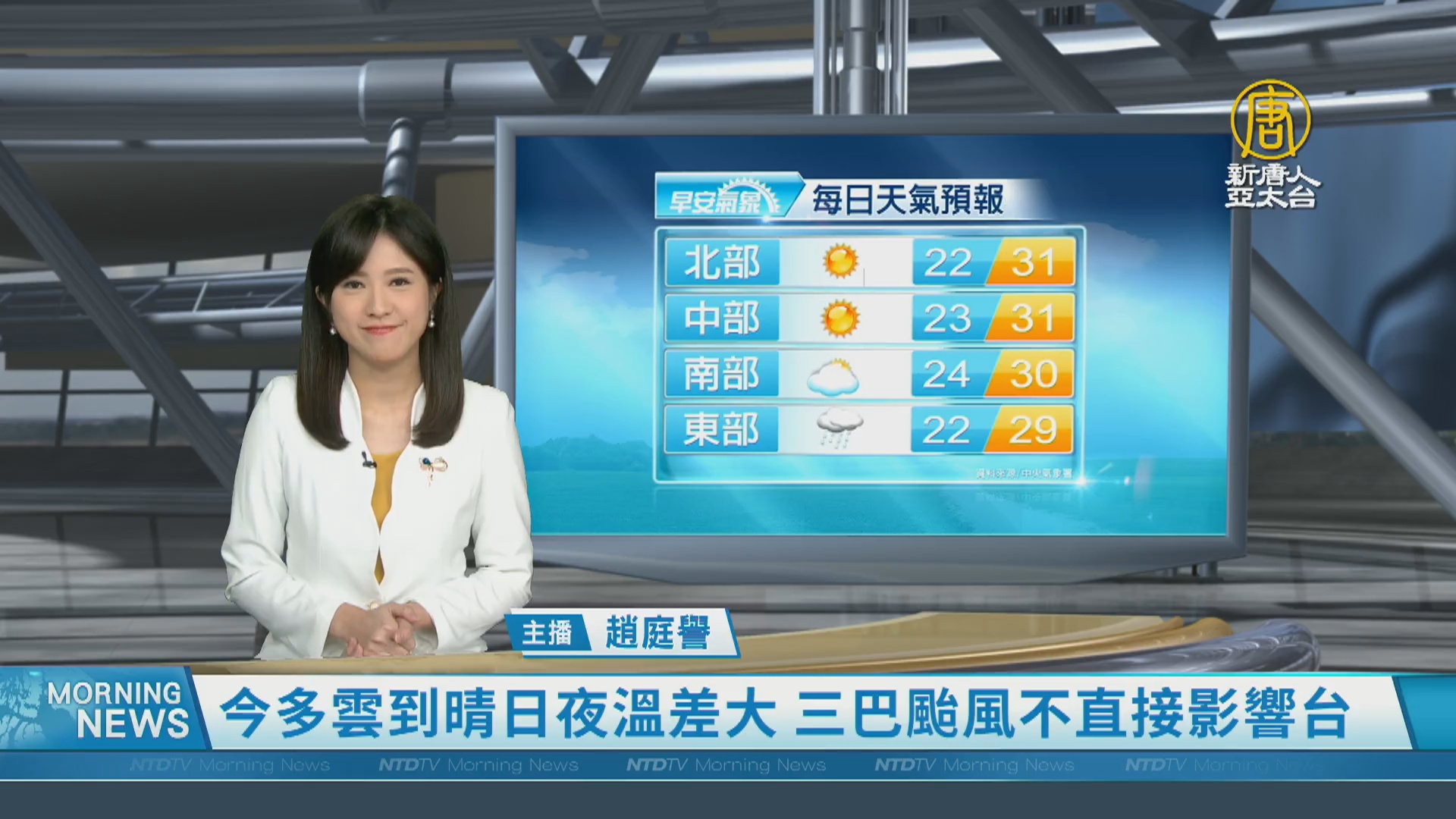 【新唐人亞太台 2023 年 10 月 19 日訊】歡迎您收看10月19日的早安新唐人,我是趙庭譽,先來帶您關心天氣。今天白天各地高溫在28到31度,但須留意日夜溫差,另外,今年第16號輕度颱風「三巴」已在昨天下午生成,預估將朝海南島的方向前進,對台灣並不會有直接影響。帶您一起來看到國際媒體重要訊息。