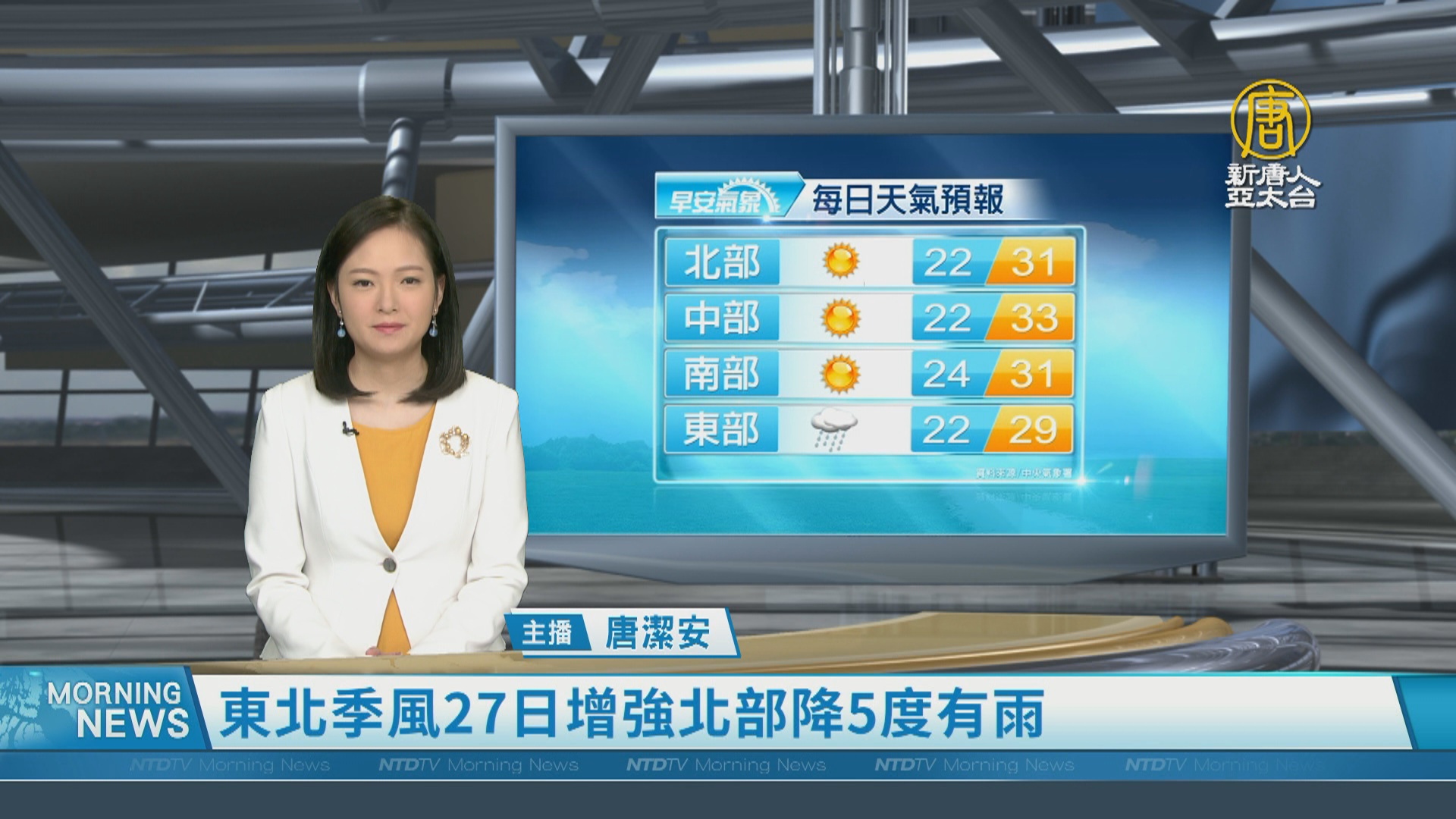 【新唐人亞太台 2023 年 10 月 24 日訊】歡迎您收看10月24日的早安新唐人,我是唐潔安,先來帶您關心天氣。昨天和今天是本週天氣相對穩定的2天,不過,星期四開始(26日)水氣增加,星期五(27日)至下週一(30日)東北季風增強及華南雲雨區東移,北部高溫降至25度,全台轉有雨。提醒觀眾朋友留意,帶您一起來看到國際媒體重要訊息。