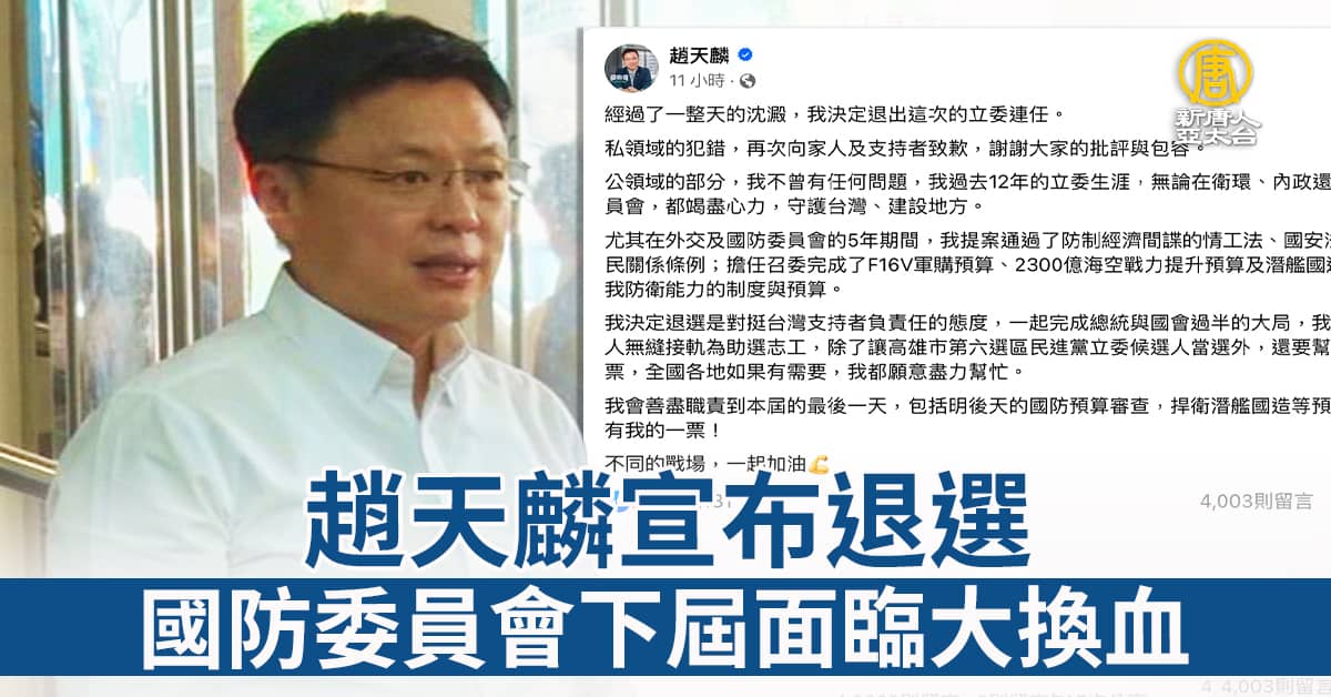 【新唐人亞太台 2023 年 10 月 25 日訊】再來看到,民進黨立委趙天麟,爆出與中國籍女子婚外情,趙天麟昨晚(24)發文宣布,決定退出這次的立委連任選舉,再次向家人及支持者致歉。