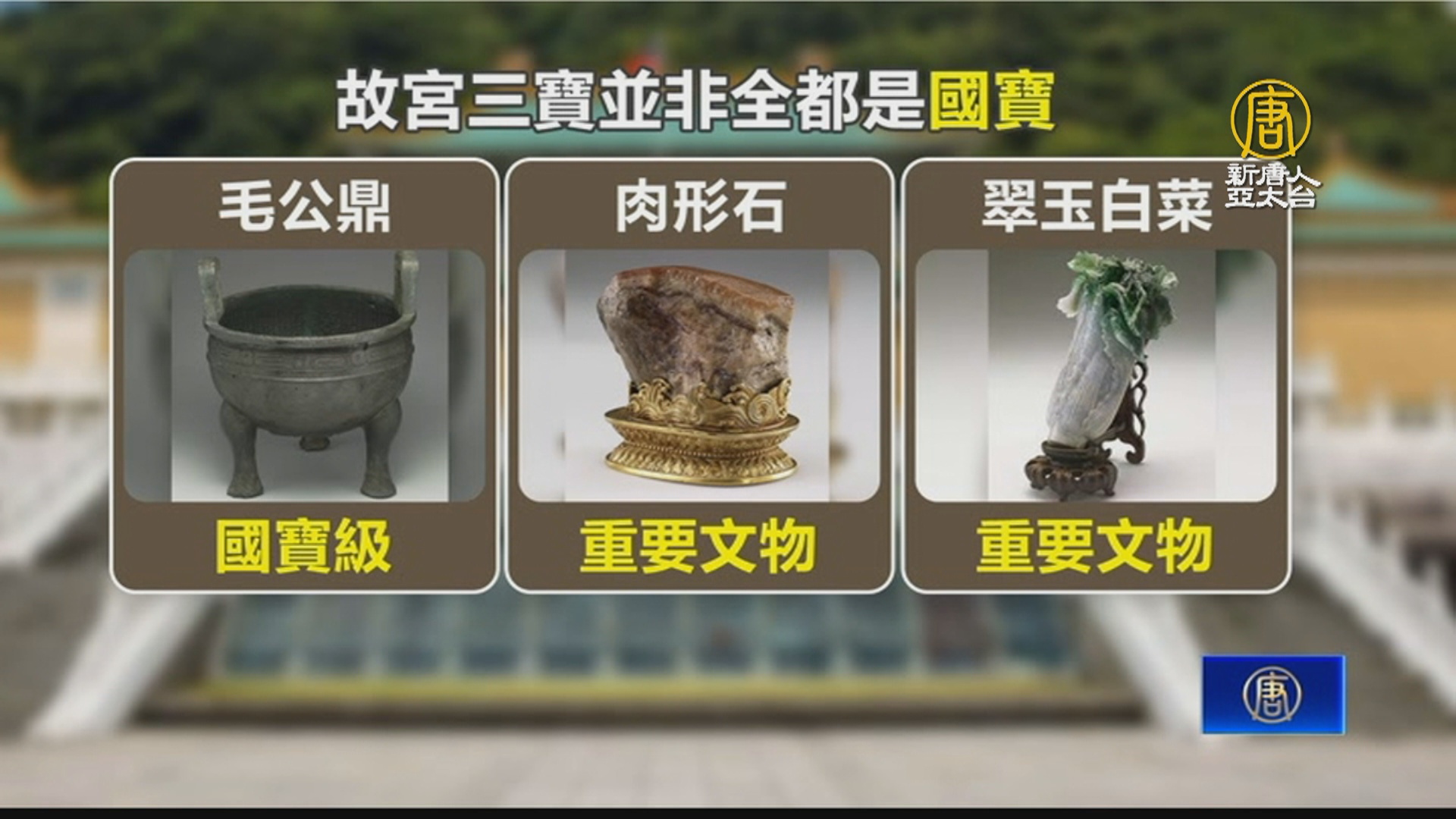 依照《文資法》規定,古物分為國寶、重要古物與一般古物等3級,故宮典藏的文物近70萬件,但真正擠進「國寶」窄門的,目前只有276件、重要古物有787件、一般古物佔35件。俗稱的「故宮三寶」,除了「毛公鼎」之外,「肉形石」,和最受歡迎的「翠玉白菜」,只被列為重要文物。