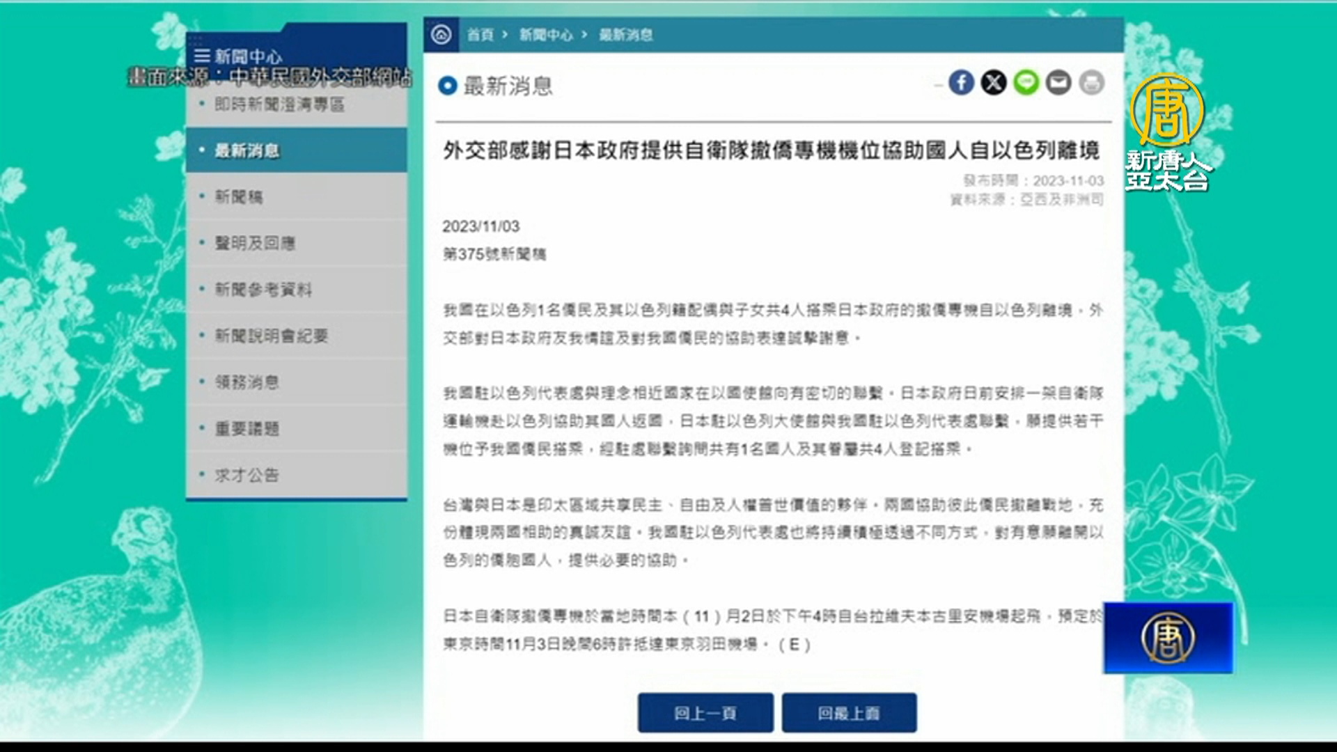 【新唐人亞太台 2023 年 11 月 03 日訊】日本政府表示,航空自衛隊的一架KC-767空中加油運輸機,2日晚間從約旦飛往以色列協助撤離日本僑民。這次撤離了20位日本公民以及兩位外籍家屬;另外,還順道載運了15位韓國人、4位越南人、1位台灣人及4位外籍家屬,一共46人。對此,中華民國外交部今天(3日)表示,對日本政府表達誠摯謝意,並指出兩國協助彼此僑民撤離戰地,充份體現兩國相助的真誠友誼。