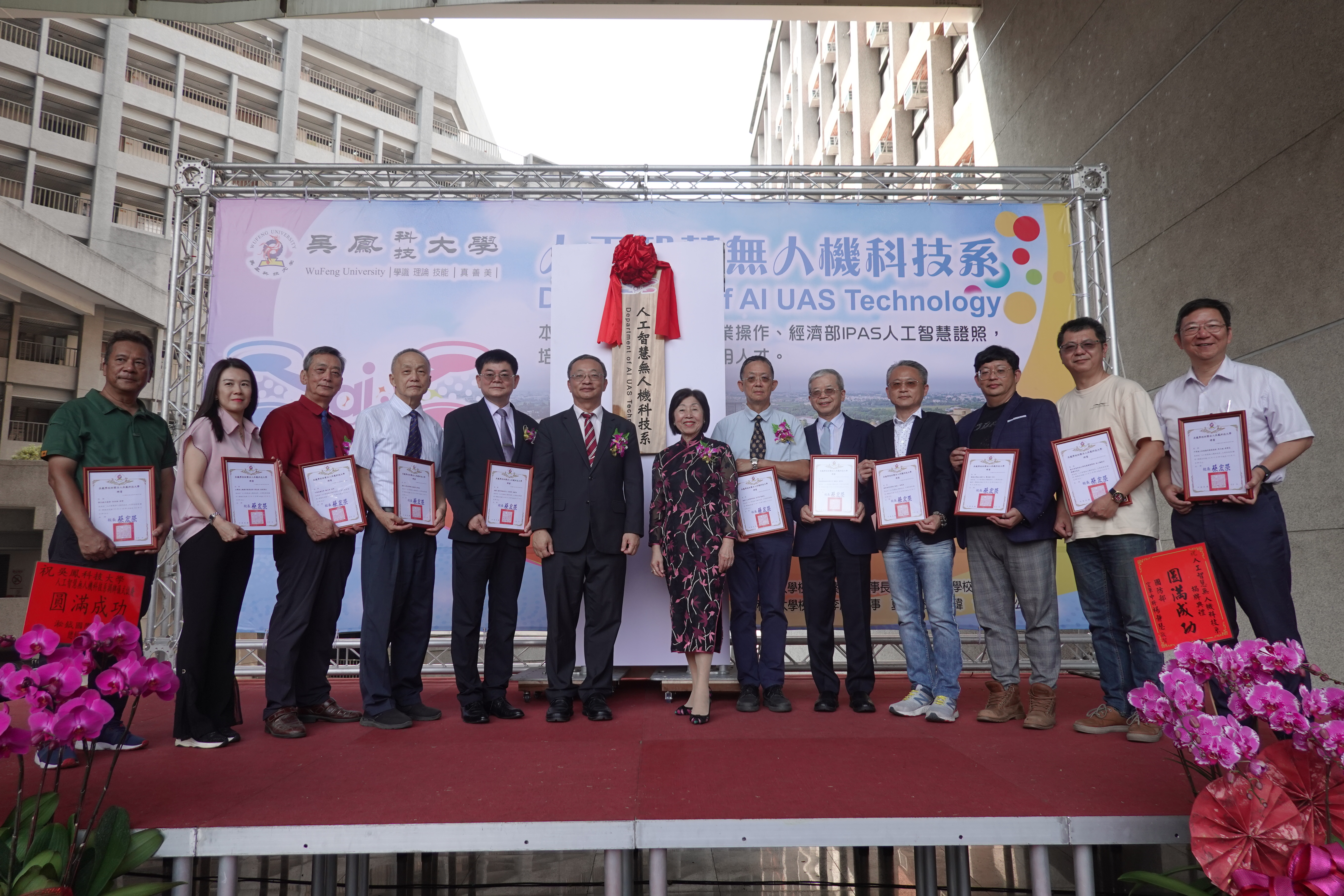 吳鳳科大設立人工智慧無人機科技系舉辦揭牌儀式,中間左蔡宏榮校長(吳鳳科技大學提供)