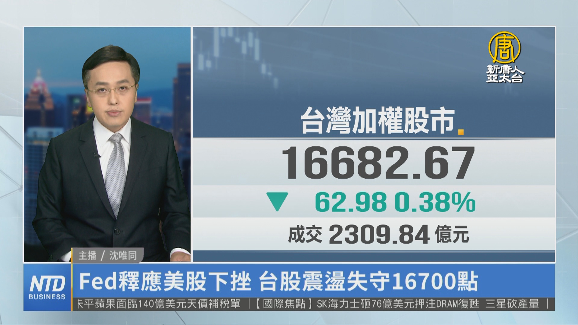 【新唐人亞太台 2023 年 11 月 10 日訊】新聞一開始帶您關心國際股市,美國聯準會主席鮑爾,對外釋出鷹派言論,美股主指聞訊下跌,特斯拉股價下滑5%,道瓊收疊220 點,標普下挫0.8%,2年期美債殖利率,破5%水位,10年期來到4.63%。台股今天(10日)同步開低震盪,電子、傳產、金融無力撐盤,加權指數失守16700點關卡,下跌62.98點,連七天漲勢止步,三大法人合計賣超20.12億元。