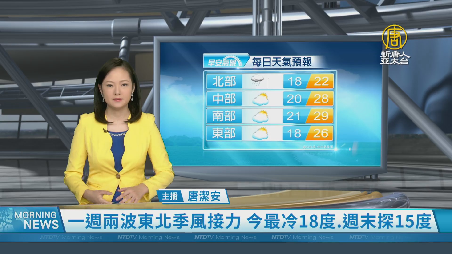 【新唐人亞太台 2023 年 11 月 13 日訊】歡迎您收看11月13日的早安新唐人,我是唐潔安,先來帶您關心天氣。迎接新的一週,今明兩天是這波東北季風最強的時候,北部及東北部低溫約攝氏18、19度,之後,週三、週四回溫;週五(17日)又會有1波東北季風來襲,北部低溫下探至15度,局部地區更低,一直到週日溫度才會回升。帶您一起來看到國際媒體重要訊息。