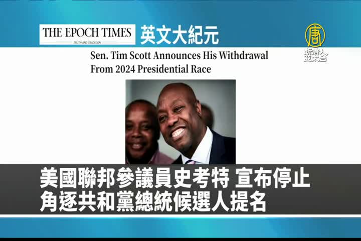 【新唐人亞太台 2023 年 11 月 14 日訊】首先來看到美國大紀元英文版報導:美國聯邦參議員史考特,宣布停止角逐共和黨總統候選人提名。
