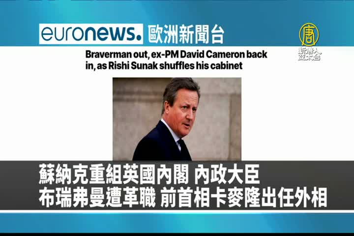 【新唐人亞太台 2023 年 11 月 14 日訊】來看到歐洲新聞台報導:蘇納克重組內閣,內政大臣布瑞弗曼遭革職,前首相卡麥隆出任外交大臣。