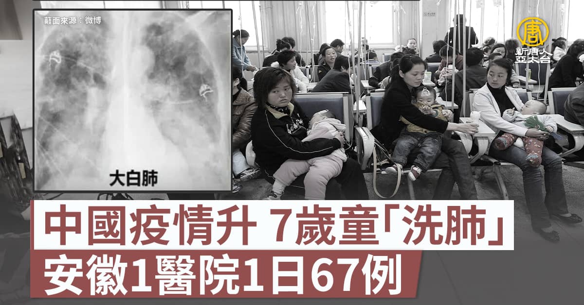 中國大陸民眾:「安徽省兒童醫院,一天洗肺67例,安徽省兒童醫院近期接診了大量因肺炎支原體感染的肺部實變、肺不張等嚴重併發症的患兒。」