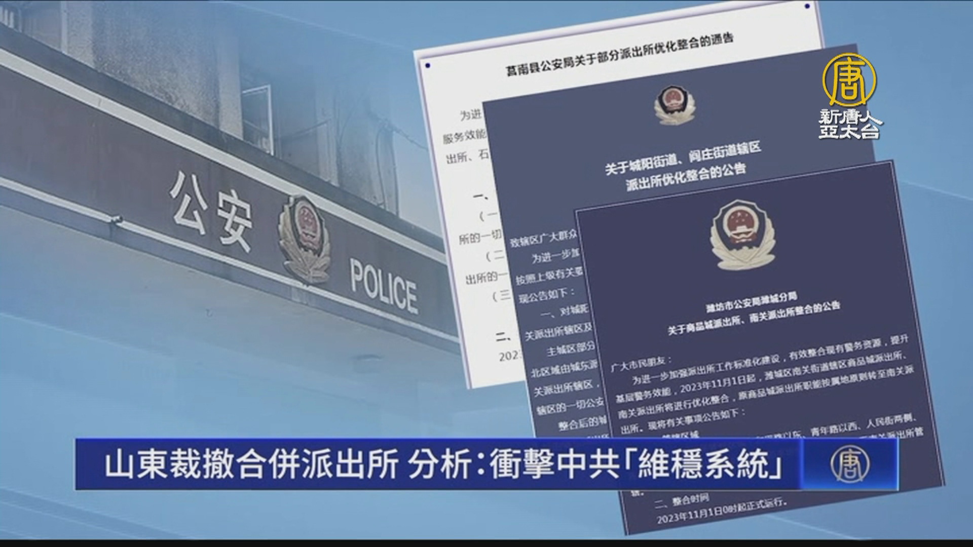 【新唐人亞太台 2023 年 11 月 14 日訊】中國的公務員降薪裁員潮不斷擴大,近期,山東省多個縣市區的公安局宣布,臨近的基層派出所整合、撤併。有評論認為,中共深陷財政危機,已養不起「維穩系統」。