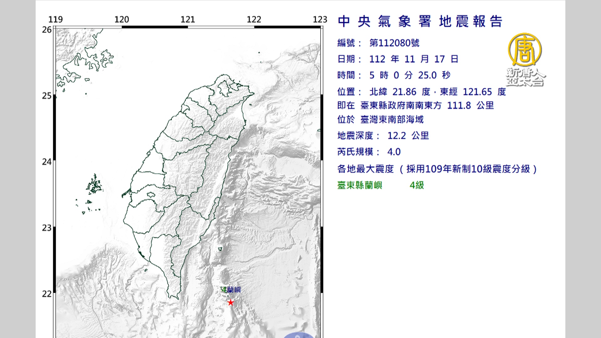 【新唐人亞太台 2023 年 11 月 17 日訊】歡迎回來,清晨地牛又翻身,根據中央氣象署資料顯示,今天清晨5點在台灣東南部海域發生芮氏規模4.0的顯著有感地震,最大震度台東縣蘭嶼4級。