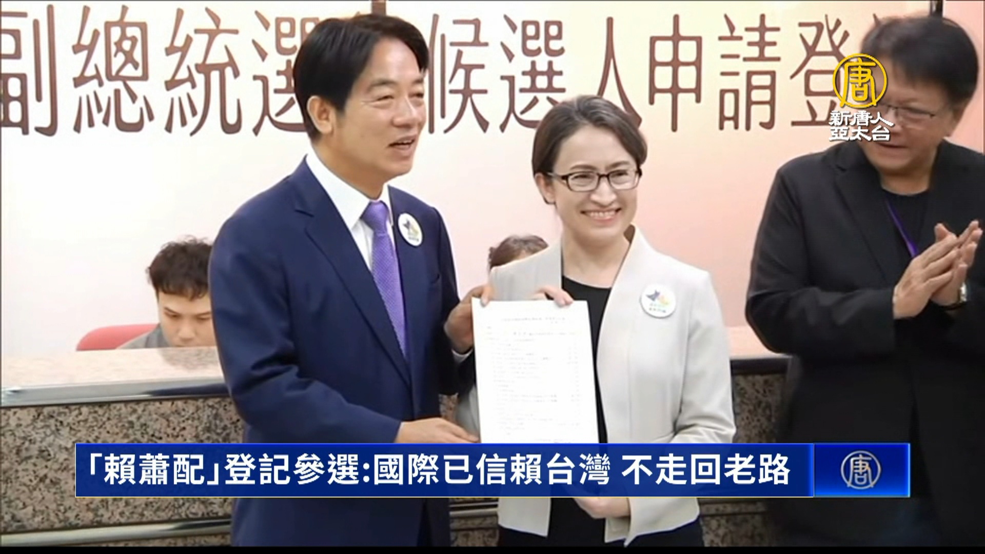 【新唐人亞太台 2023 年 11 月 21 日訊】新聞開始先來關心,2024總統大選,今天進入倒數53天,民進黨總統參選人賴清德、副總統參選人蕭美琴,今天率先前往中選會完成參選登記手續。賴清德以三層意義說明「賴蕭配」參選,除了要持續守護台灣,也代表台灣人民要選擇信賴台灣的方向。