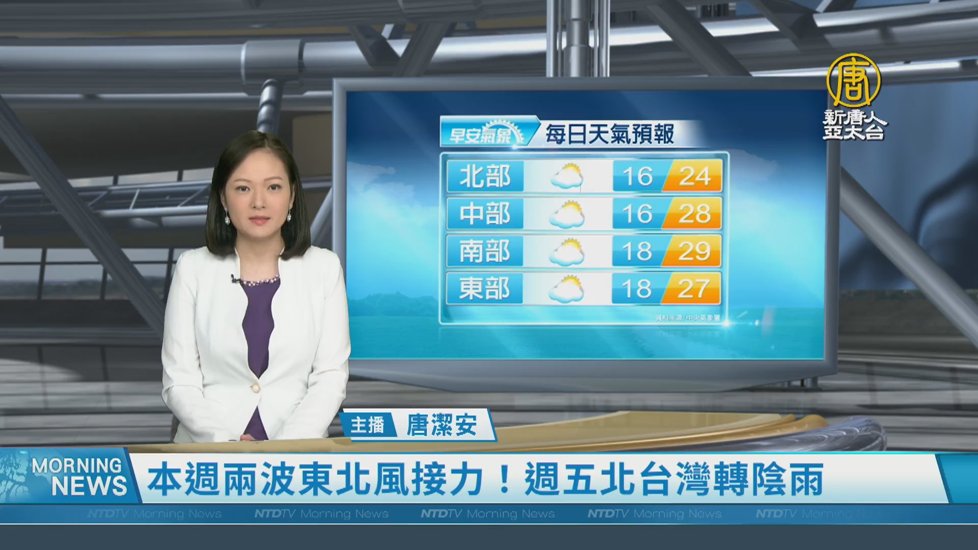 【新唐人亞太台 2023 年 11 月 27 日訊】歡迎您收看11月27日的早安新唐人,我是唐潔安,先來帶您關心天氣。這個星期將有兩波東北季風接力報到,星期三前偏乾,星期四起轉濕涼,另外,星期五至下星期天受到東北季風影響,北台灣轉為陰雨天氣,新竹以南則是多雲到晴天氣,不過,早晚溫差仍大。帶您一起來看到國際媒體重要訊息。