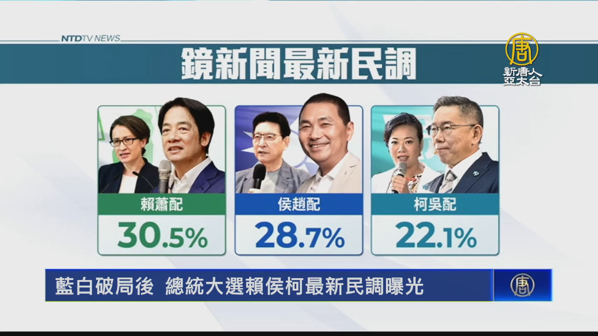 【新唐人亞太台 2023 年 11 月 27 日訊】台灣總統大選今天有兩份最新民調發布,其中,鏡新聞,民調是在三黨候選人登記確定後進行的,結果顯示,民進黨賴蕭配獲得30.5%支持度、國民黨侯趙配28.7%居次、民眾黨柯吳配支持度為22.1%淪為第三。不過,另一份民調,台灣民意基金會在藍白破局前的11月19到22日做調查,基金會稱柯文哲以31.9%領先,賴清德則是29.2%第二名,侯友宜則是23.6%,兩份民調結果差異大。