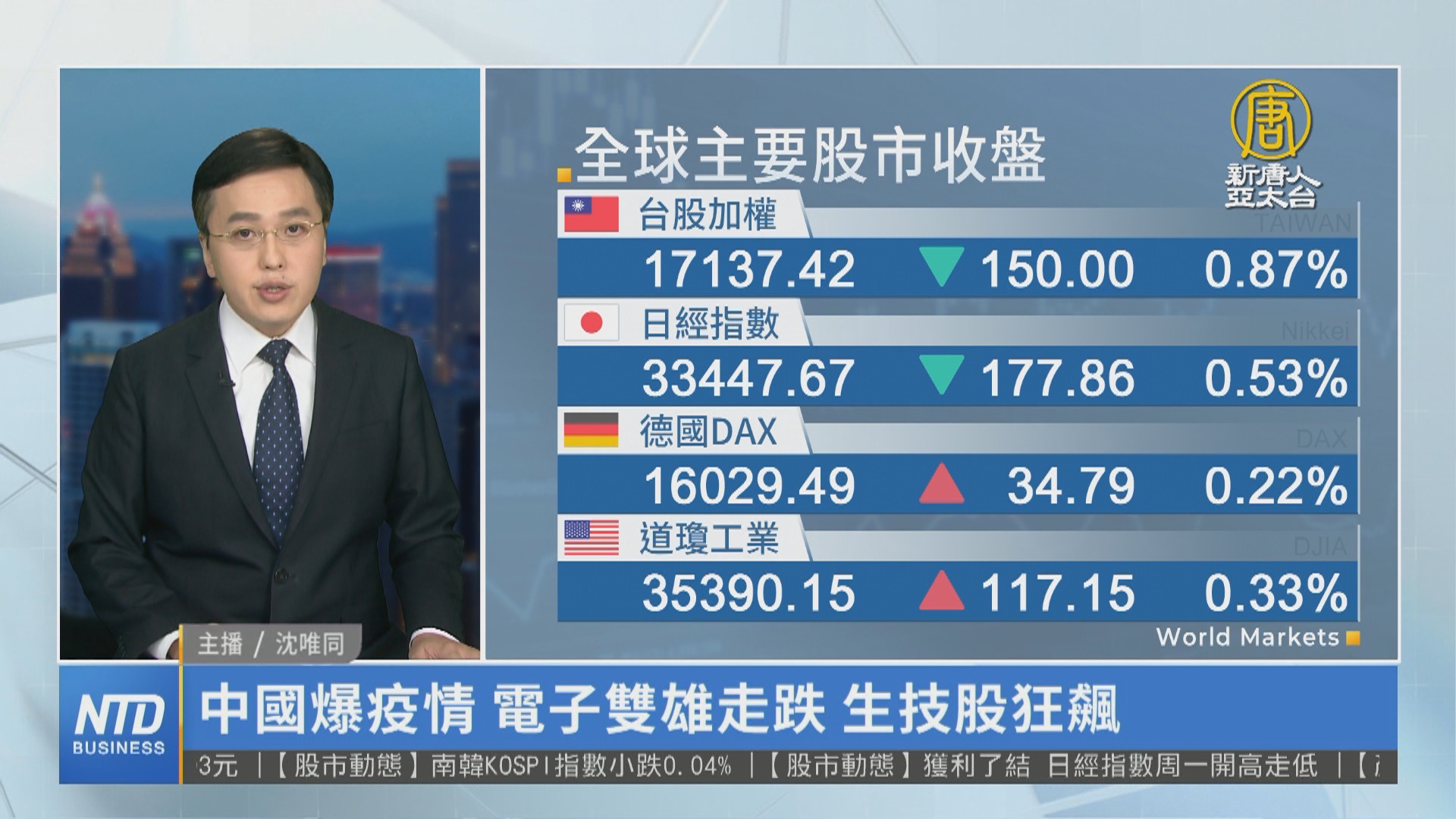 【新唐人亞太台 2023 年 11 月 27 日訊】新聞一開始帶您關心金融市場,美國三大指數,連續四周收紅,華爾街預期美股標普指數有望再創新高,不過周一亞洲股市多數拉回震盪,台股早盤開高後迅速走低,台積電下跌1%,聯發科也走弱,中國傳出疫情大流行,加上台灣醫療科技展即將登場,多家生技醫療族群,股價直衝漲停,國光生、永信等業者漲幅都超過5%,加權指數終場下跌150點,收在17137.42點。