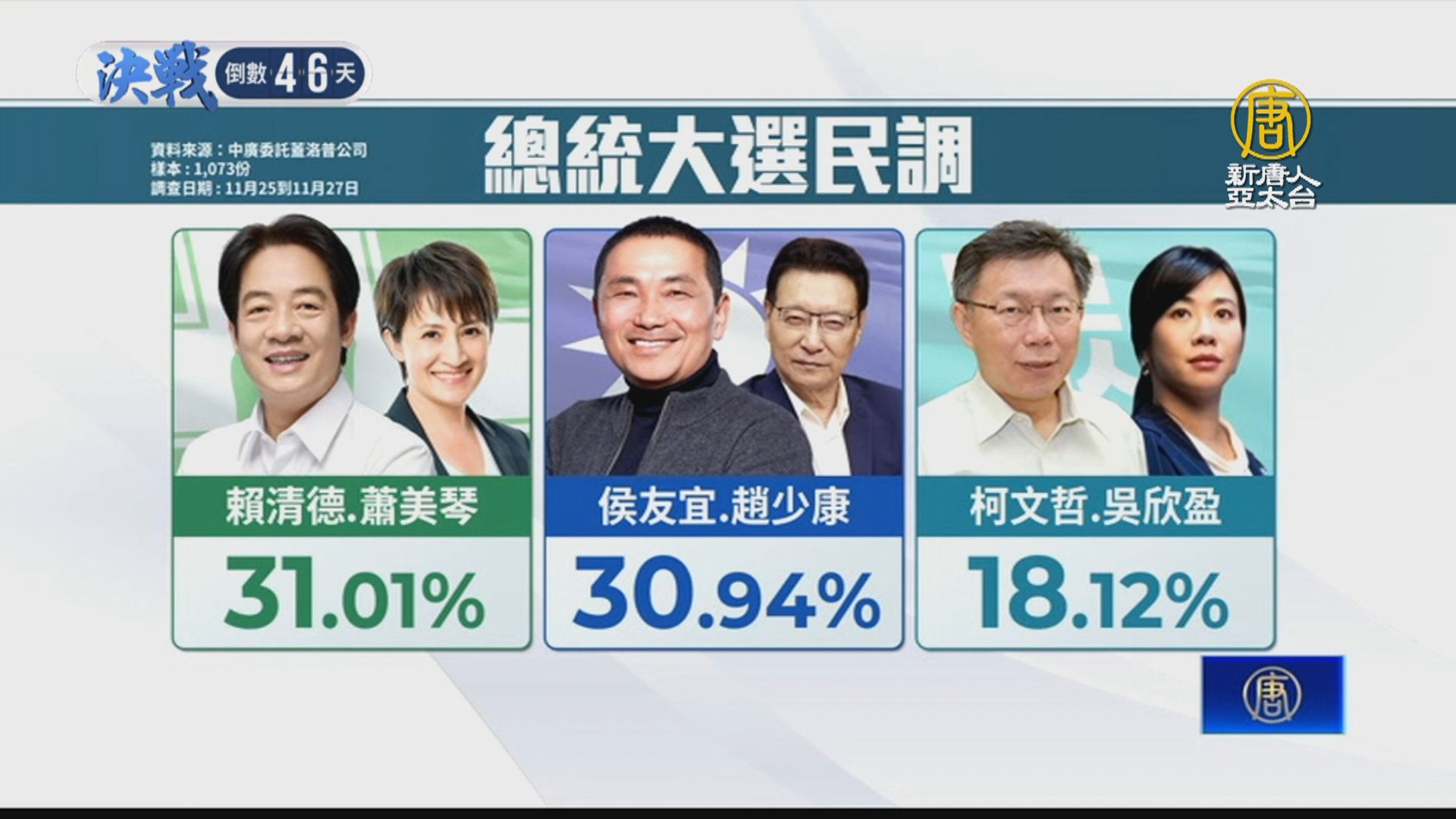 【新唐人亞太台 2023 年 11 月 28 日訊】2024總統大選,今天進入倒數第46天,來看到最新民調,中廣公司委託公司蓋洛普的調查指出,目前仍由民進黨賴蕭配31.01%居冠領先,國民黨侯康配30.94%緊跟在後,不過,兩組差距只有0.07%。而民眾黨的柯吳配僅18.12%,低於兩成。