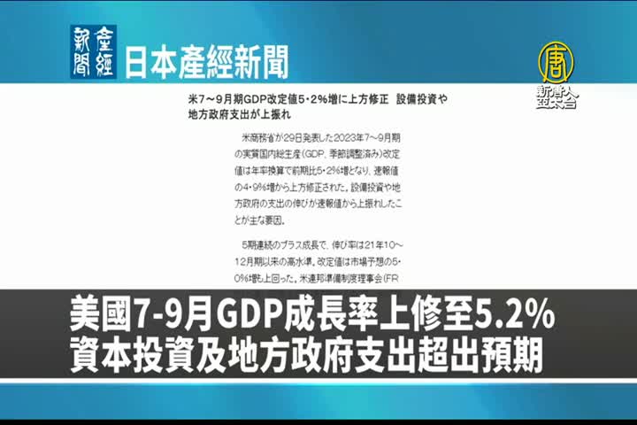 【新唐人亞太台 2023 年 11 月 30 日訊】來看到日本產經新聞報導:美國7到9月GDP成長率上修至5.2%,資本投資及地方政府支出超出預期。