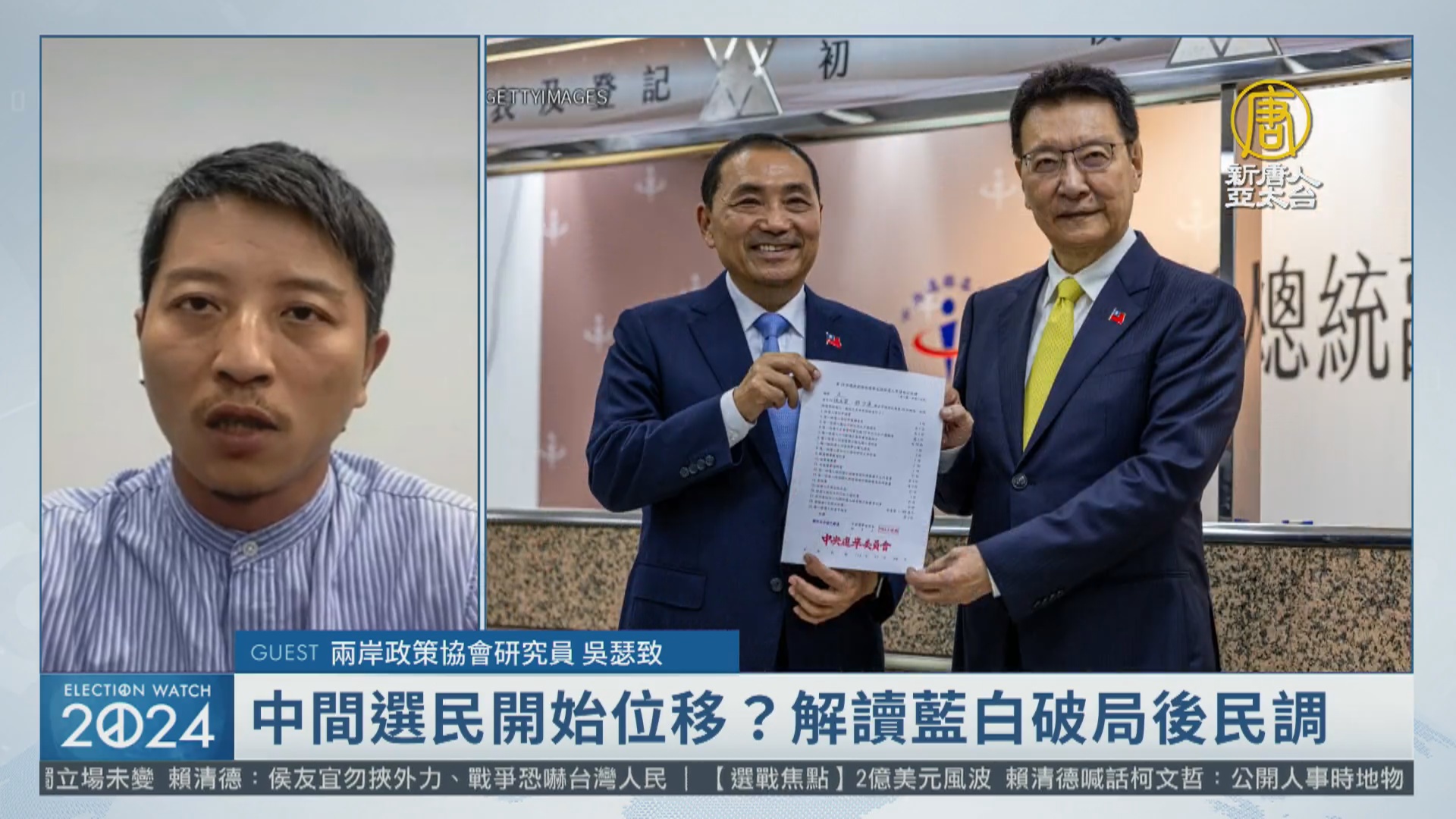 【新唐人亞太台 2023 年 11 月 30 日訊】上周五(24日)綠、藍、白三組候選人完成登記,之後民調一致顯示國民黨「侯趙配」的支持度竄升,與民進黨「賴蕭配」的差距縮小到誤差範圍之內,而民眾黨「柯吳配」的支持度則是持平或下滑,落後「侯趙配」超過8%。目前的民調是否代表選情回歸傳統的藍綠對決?請教您的觀察。