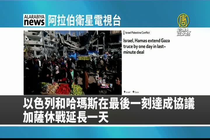 【新唐人亞太台 2023 年 12 月 01 日訊】來看到阿拉伯衛星電視台報導:以色列和哈瑪斯在最後一刻達成協議,加薩休戰延長一天。