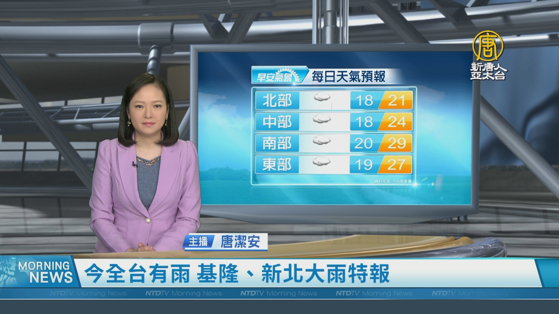 【新唐人亞太台 2023 年 12 月 04 日訊】歡迎您收看12月4日的早安新唐人,我是唐潔安,先來帶您關心天氣。迎接新的一週,今天全台有雨,氣象署也對新北、基隆地區發布大雨特報,白天北台灣高溫約20到23度,中部及花蓮24、25度,南部及台東26到29度,預計溼冷天氣要一直持續到星期三。帶您一起來看到國際媒體重要訊息。