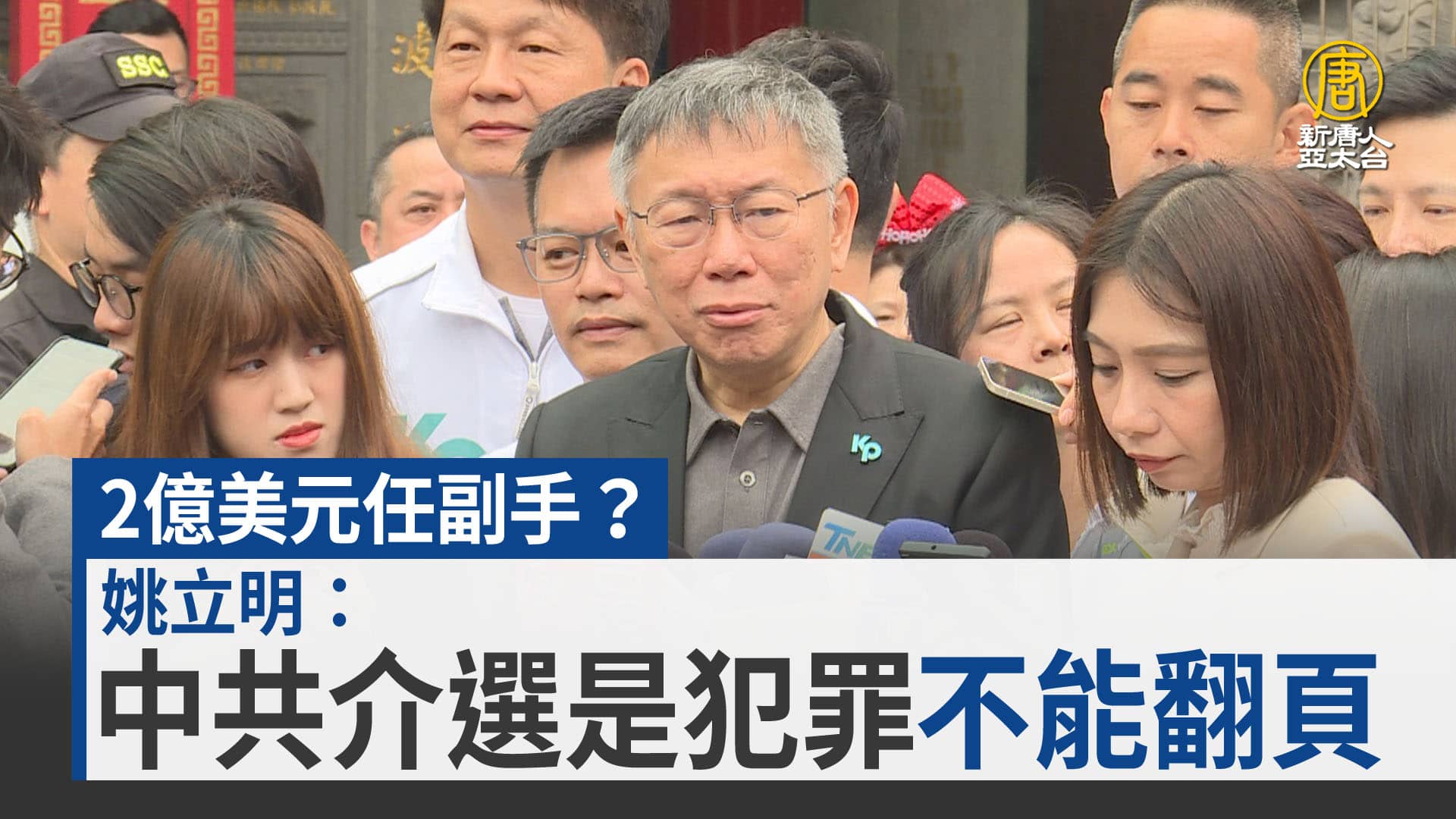 【新唐人亞太台 2023 年 12 月 04 日訊】民眾黨總統參選人柯文哲日前指出,有人開價2億美元希望他擔任副手。民進黨總統參選人賴清德競總主委姚立明今天再召開記者會指出,自台灣開放選舉以來,這是中共介入台灣選舉最明確的事件,且已是明顯犯罪行為,柯文哲既是證人也是受害者,不能說翻頁就翻頁過去。