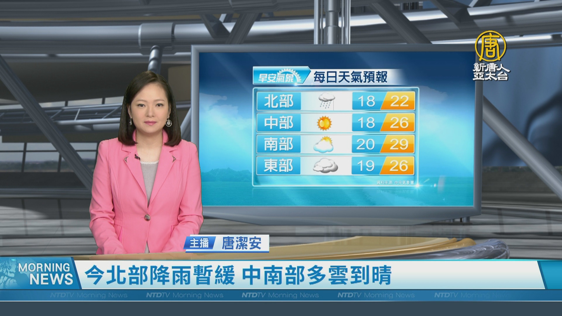 【新唐人亞太台 2023 年 12 月 05 日訊】歡迎您收看12月5日的早安新唐人,我是唐潔安,先來帶您關心天氣。今迎風面的基隆北海岸及東半部地區仍有局部短暫雨,其他地區降雨趨緩,中南部將是多雲到晴,不過,今天晚間到週三上半天,環境水氣再次增多,提醒觀眾朋友留意天氣變化。帶您一起來看到國際媒體重要訊息。