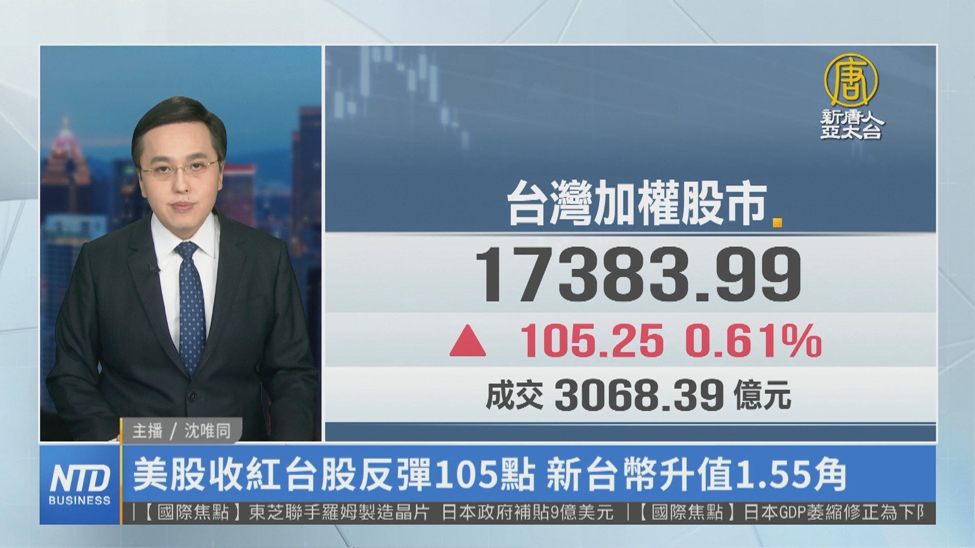 【新唐人亞太台 2023 年 12 月 08 日訊】新聞一開始帶您看到國際股市,美國非農就業報告出爐前夕,標普 500 指數,週四上揚,道瓊指數小漲逾60點,接近歷史高點,由於日本央行官員發言,帶動日圓匯價創下近一年最大漲幅,新台幣也跟著走強,周五新台幣以31.374元作收,升值1.55角。台股今天人工智慧概念股、半導體領軍, IC 設計族群走強之下,收盤上漲105點,收17383.99點。三大法人合計買超122.35億元。