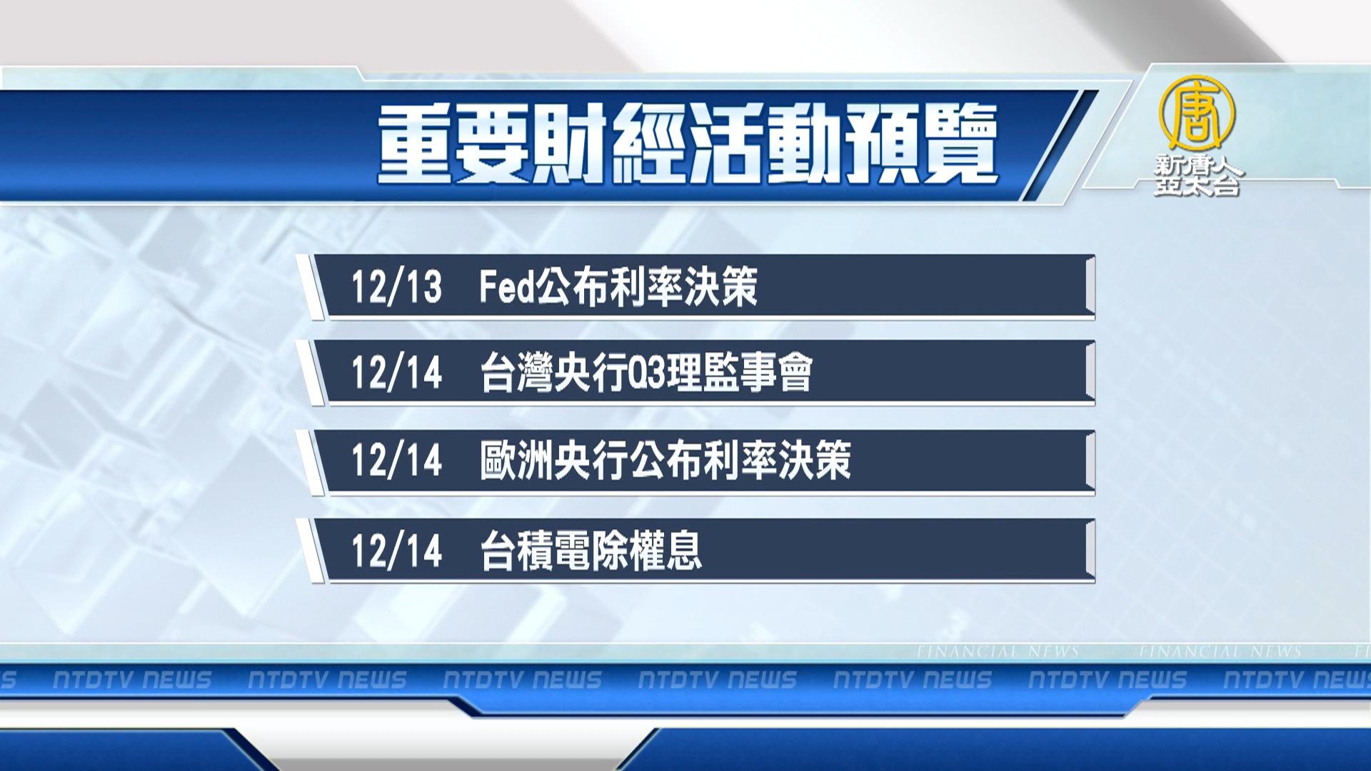 【新唐人亞太台 2023 年 12 月 09 日訊】帶您看到下週,有哪些重要的財經活動。
