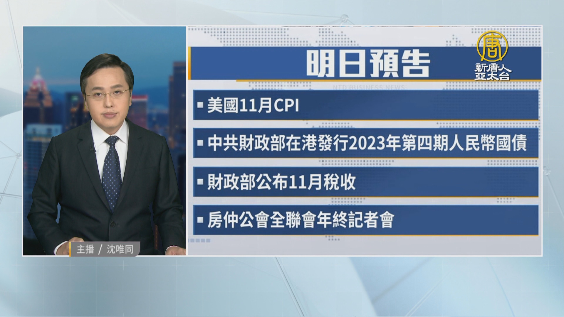 【新唐人亞太台 2023 年 12 月 11 日訊】帶您看到明天,12月12日,星期二,有哪些重要的財經活動。 美國公布11月CPI。中共財政部在港發行2023年第四期人民幣國債。台灣財政部公布11月稅收。房仲公會全聯會年終記者會。