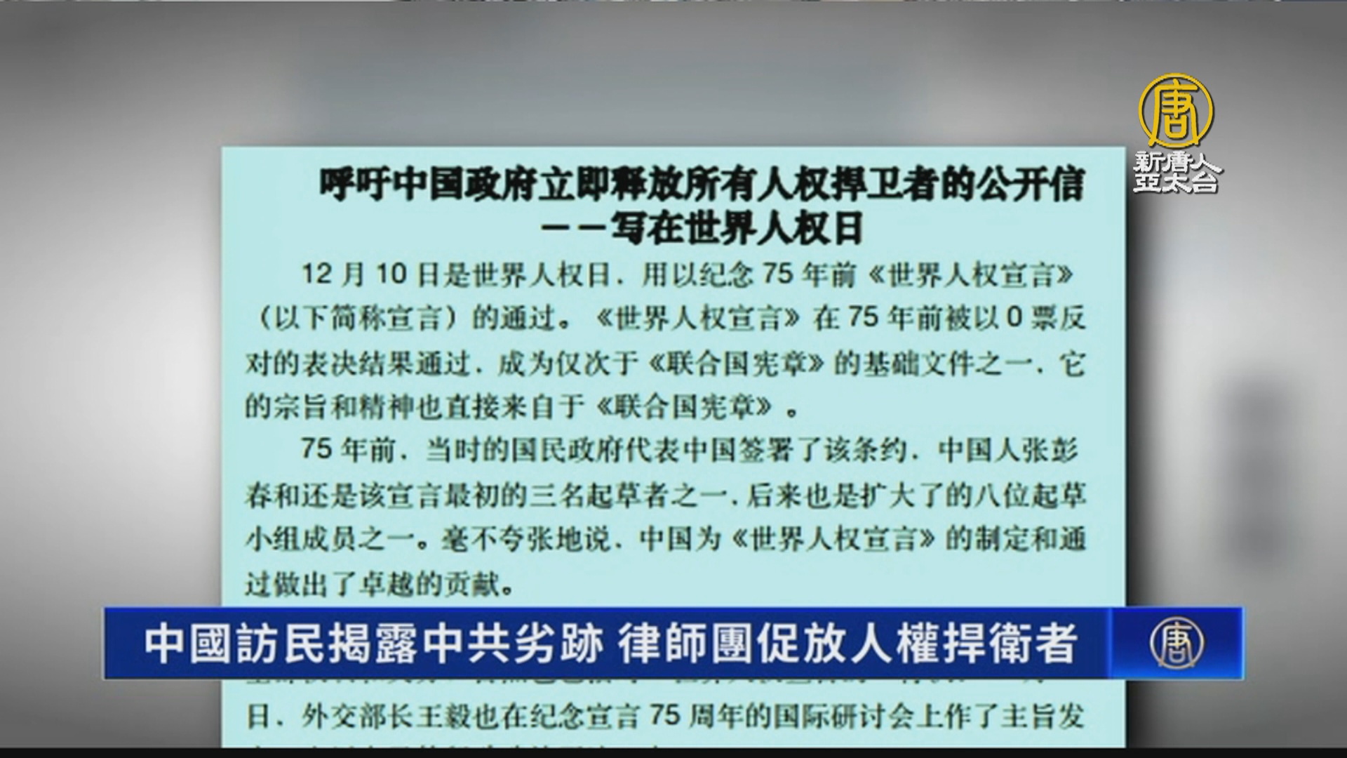【新唐人亞太台 2023 年 12 月 11 日訊】好,在12月10日國際人權日這天,中國多地訪民到中共「國家信訪辦」維權,中國人權律師團也發出公開信,呼籲中共政府立即釋放所有人權捍衛者。