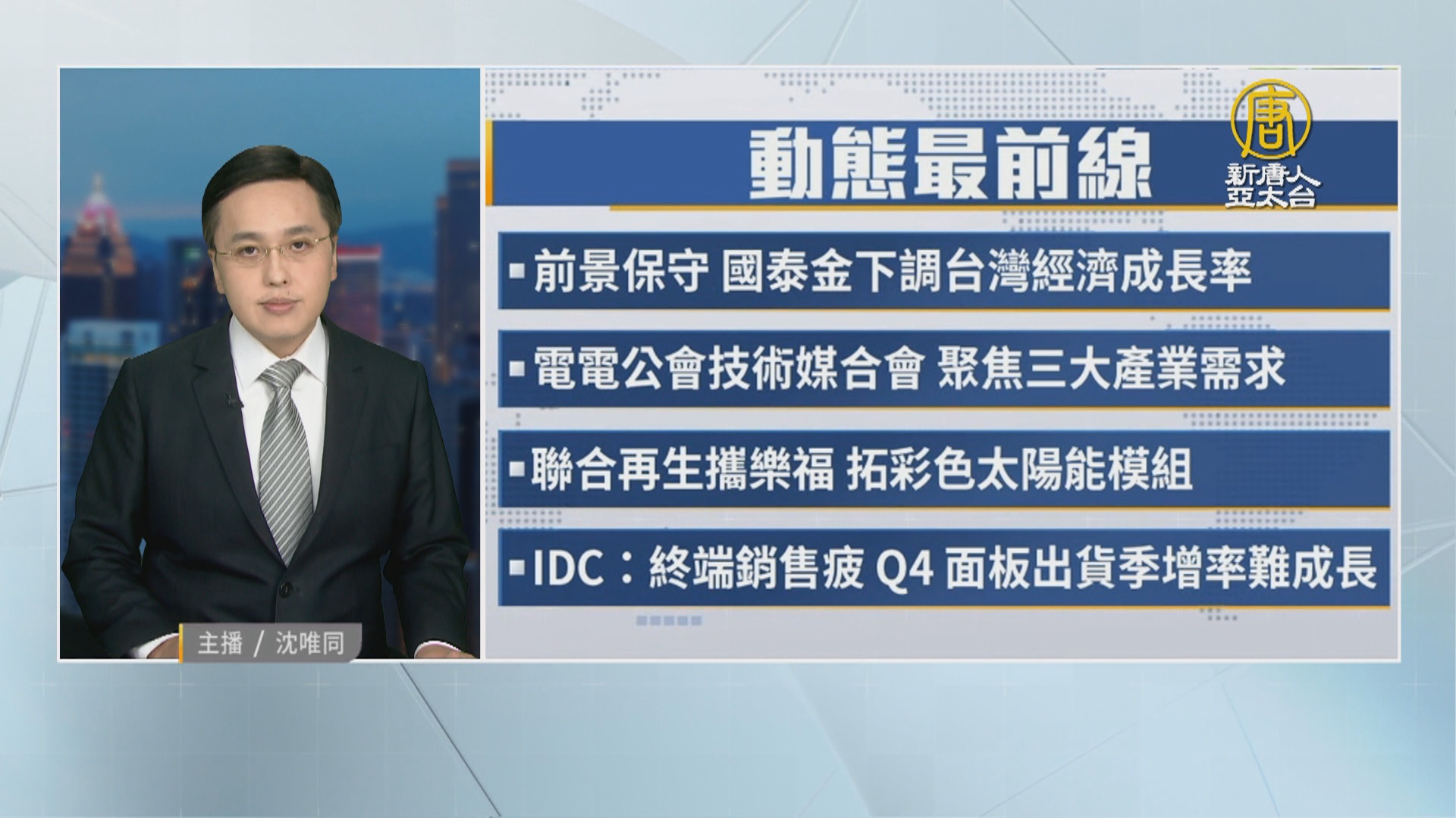 【新唐人亞太台 2023 年 12 月 13 日訊】帶您看到今天的產業動態。國泰金團隊今天表示,預測台灣今年經濟成長率從1.3%下修到1.2%,明年自2.9%下修至2.8%,估台灣央行明天利率維持不變;經濟部針對電電公會提出的「AIoT及晶片應用」、「高階製造及顯示技術」、「智慧車電及綠能」三大主軸,舉辦技術媒合會,吸引超過300位企業研發主管面對面洽商;聯合再生能源,與彩色太陽能模組領導廠商樂福太陽能,共同宣布合作開發建築整合太陽能。能讓建物上的太陽能板,外觀顏色融入建築設計;IDC報告顯示,各面板買家預期第四季終端銷售動能不濟,10月出貨對比9月明顯衰退。