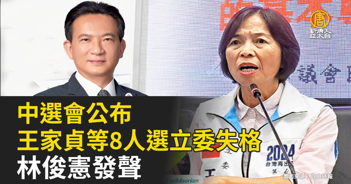 【新唐人亞太台 2023 年 12 月 15 日訊】中選會今天審定立法委員選舉候選人名單,區域、平地原住民及不分區立委參選人中,8人不符規定。其中國民黨台南市立委參選人王家貞,近期因偽造文書罪判刑7月並宣告緩刑2年定讞,依據今年6月所修訂的《選罷法》排黑條款,確定無法參選立委。外界預期同選區對手林俊憲,可輕鬆過關。林俊憲也發聲明表示「法律問題就讓法律去解決,不要企圖炒作成政治問題」。而高雄市立委參選人朱磊,原住香港,因尚未在台設籍滿10年,不得登記為候選人。還有3位立委參選人,藍信祺、黃秀龍、歐陽儀雄、皆因犯槍砲彈藥刀械管制條例,也不得登記為候選人。
