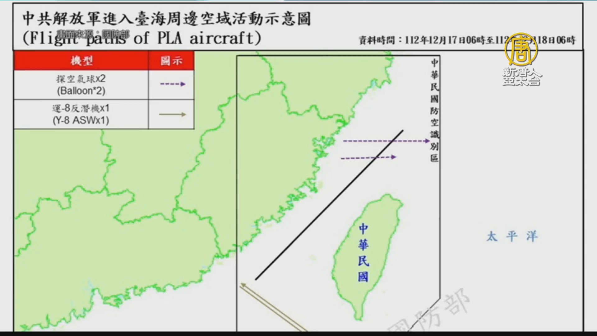 【新唐人亞太台 2023 年 12 月 18 日訊】國際關注台海情勢,中華民國國防部表示,到今天18日上午6點為止的過去24小時內,共偵獲共機6架次、共艦2艘次,在台海周邊活動。另外昨天上午9點及下午2點多,還偵獲2枚中共探空氣球,逾越台海中線北端,位在基隆西北方約110浬,高度約2萬7千呎以下,繼續向東飄行,並分別在昨天上午9點半、下午4點半左右消失。國軍運用任務機、艦及岸置飛彈系統嚴密監控與應處。