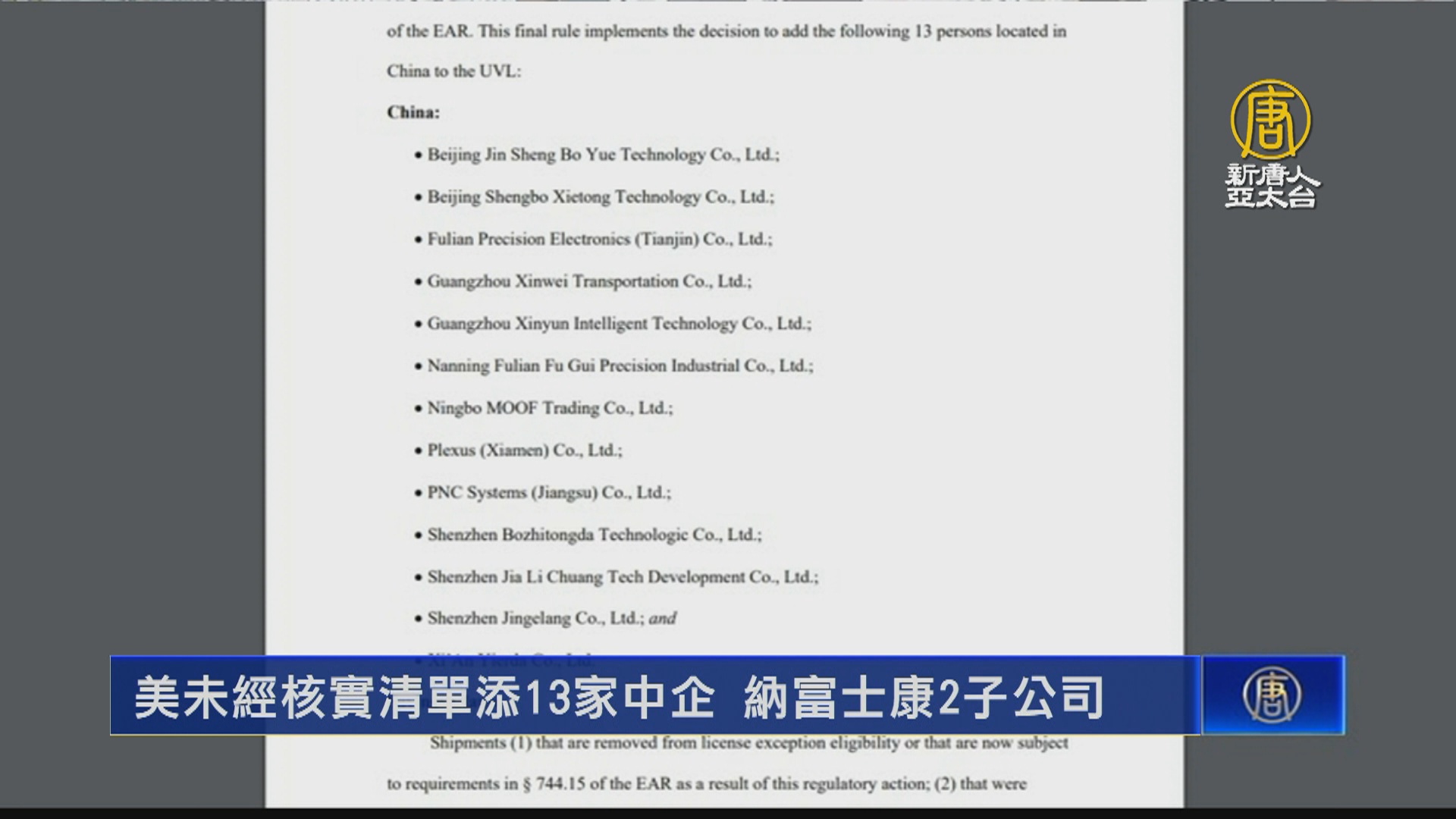 【新唐人亞太台 2023 年 12 月 20 日訊】美國商務部工業和安全局(BIS)19日發布公告,已把13家中國企業列入「未經核實清單」。被列入清單的中國企業包括江蘇至純科技(PNC Systems)、北京盛博協通科技、廣州信威交通、廈門貝萊勝電子(Plexus)、天津富聯精密電子與南寧富桂精密工業等。其中,天津富聯精密電子與南寧富桂精密工業,是富士康旗下子公司。根據拜登政府政策,如果外國政府阻止美國官員,對未經核實清單上的公司進行現場檢查,美國政府將在60天後,列入限制度更高的「實體清單」。
