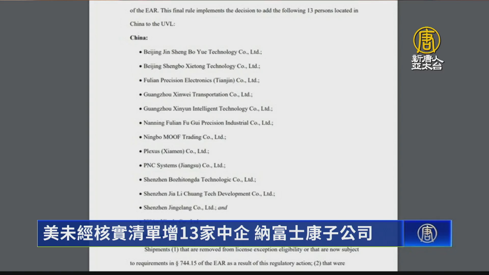 被列入清單的中國企業包括江蘇至純科技(PNC Systems)、北京盛博協通科技、廣州信威交通、廈門貝萊勝電子(Plexus)、天津富聯精密電子與南寧富桂精密工業等。其中,天津富聯精密電子與南寧富桂精密工業,是富士康旗下子公司。